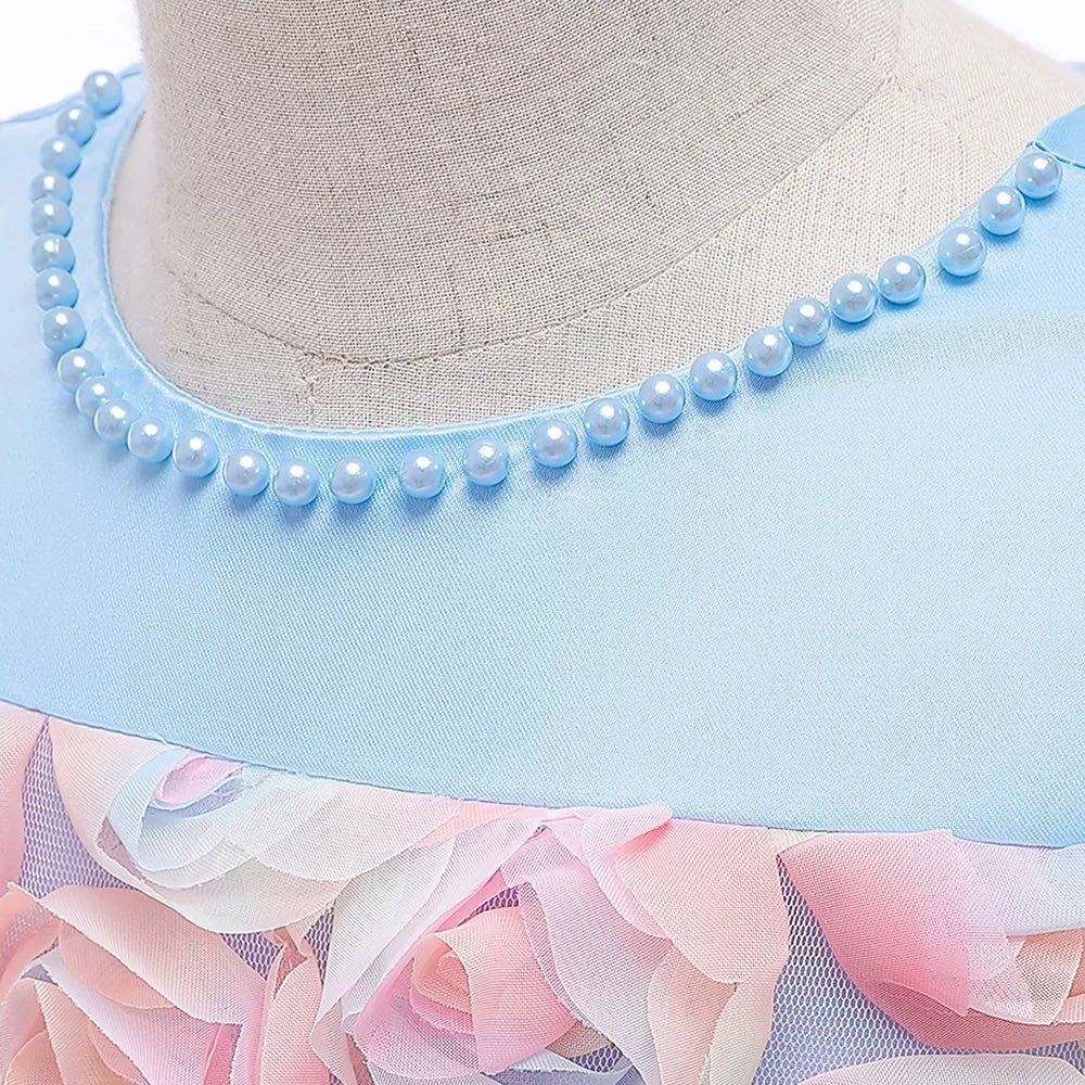 膝上の丈になります。上身の花びらが鮮やかで可愛い、ドレス下部分はふんわりです。