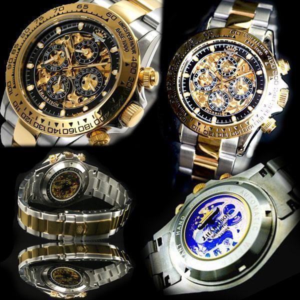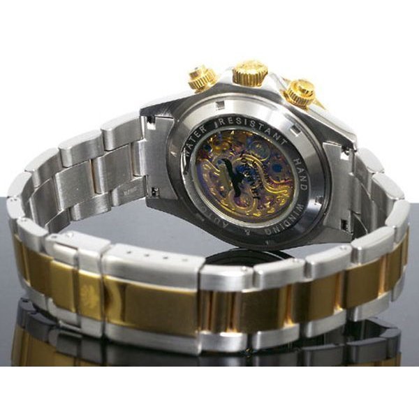 マルチカレンダー(月、日付、曜日)、24時間計、両面スケルトン、ダブルロック式バックル、日常生活防水