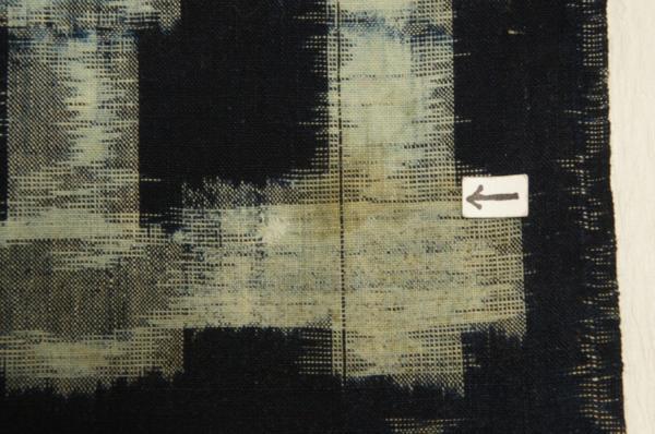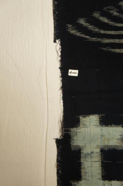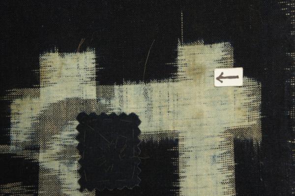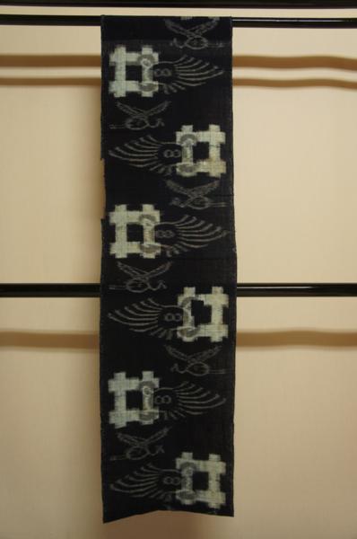 柄附木綿濃藍色絵絣模様タペストリー 裏側にタペ棒通しの布付