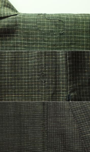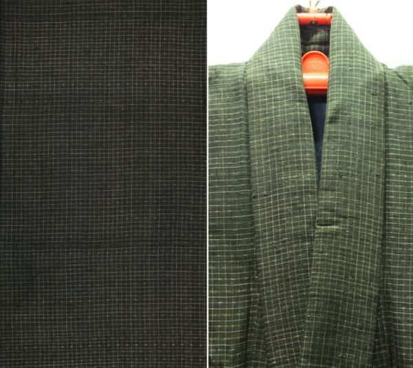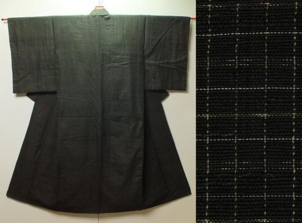 素材:正絹。着丈138.5cm、裄60.5cm、袖幅30cm、袖丈50.5cm、前幅22.5cm、後幅30cm。裄約6cm伸びます。こげ茶色系です。擦れて薄くなっている箇所あります。前右身頃の胸下あたりに擦りきれて薄くなっている箇所があります。前左身頃の胸あたりに1.5cmの掛継ぎ跡があります。後右肩あたりに3.5cm×4cmの掛継ぎ跡があります。状態は写真をご参照頂けますようどうぞよろしくお願いいたします。 【撮影時の照明の加減で実物の色よりも青白く写っている場合があります。】