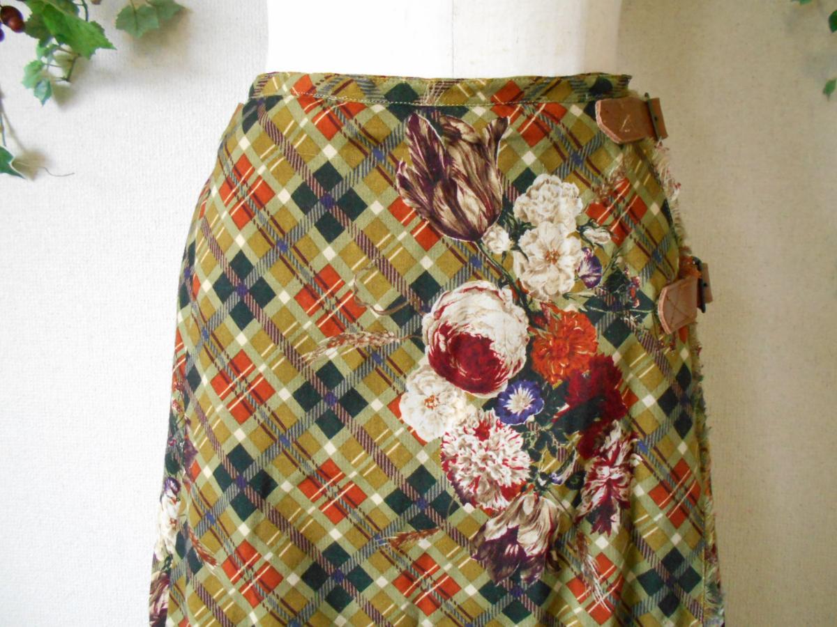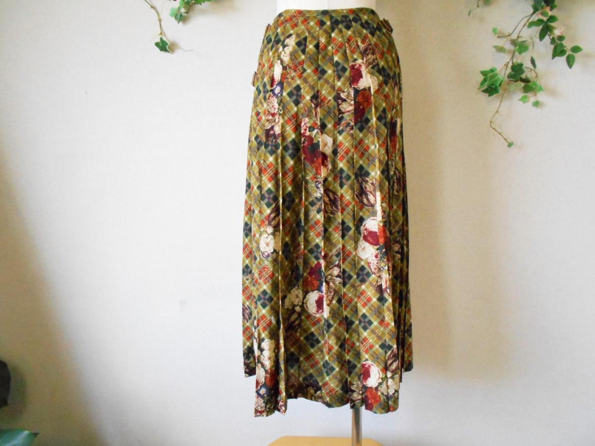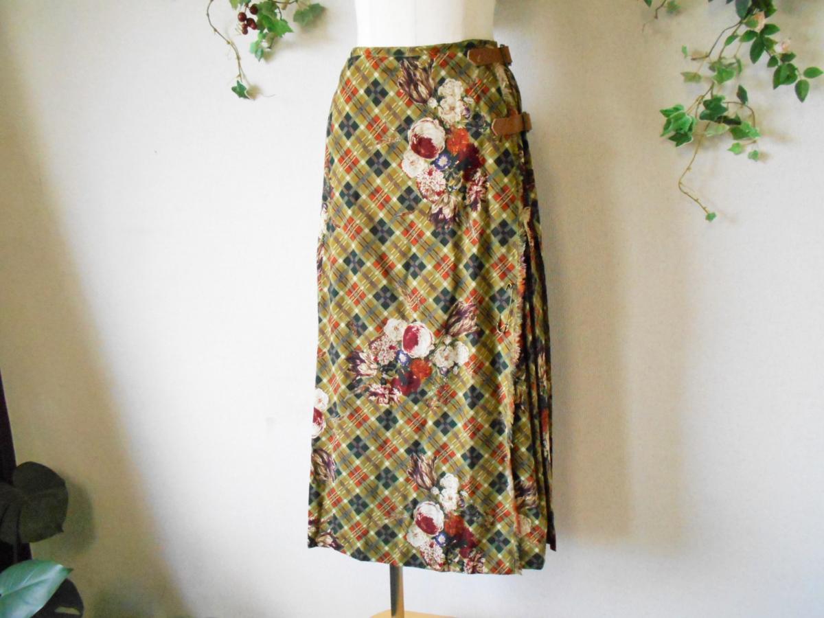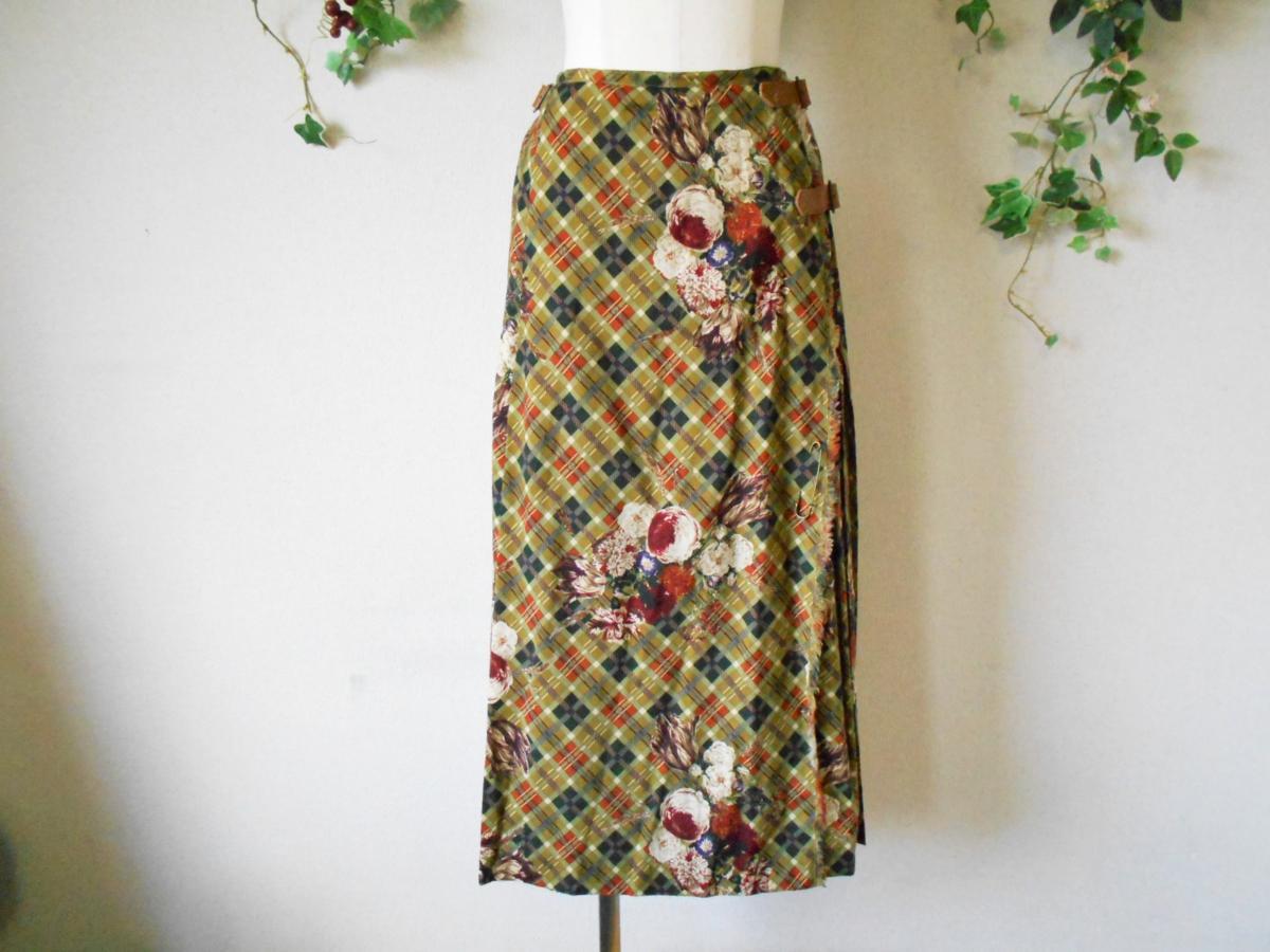 【ポイント】インゲボルグの巻スカートになります。お色はグリーン系ベースで、チェックとお花の柄が全体に入っています。前の重ねる部分以外にはプリーツが使用されていて、インゲボルグやピンクハウスでは定番的なデザインのスカートです。