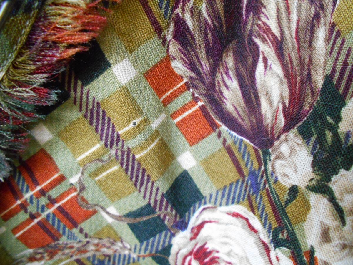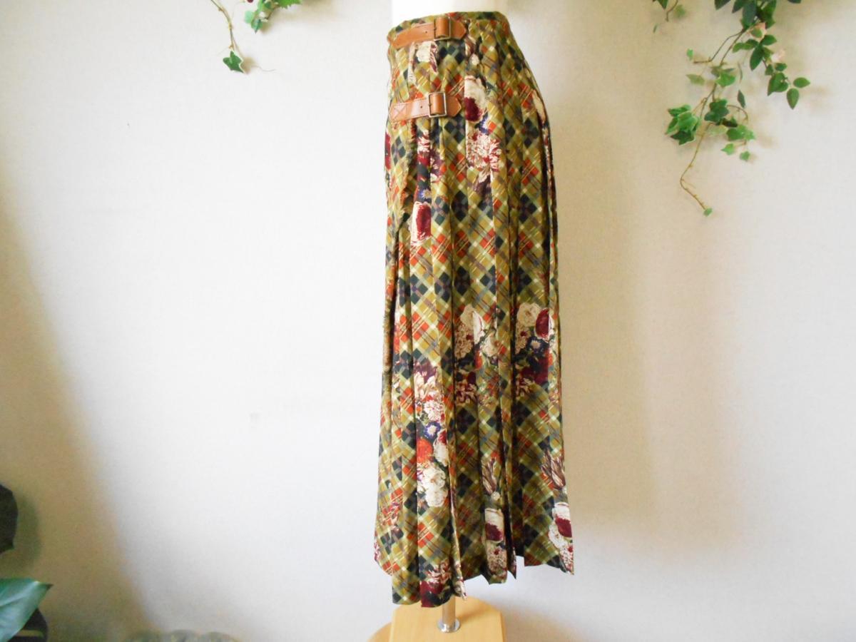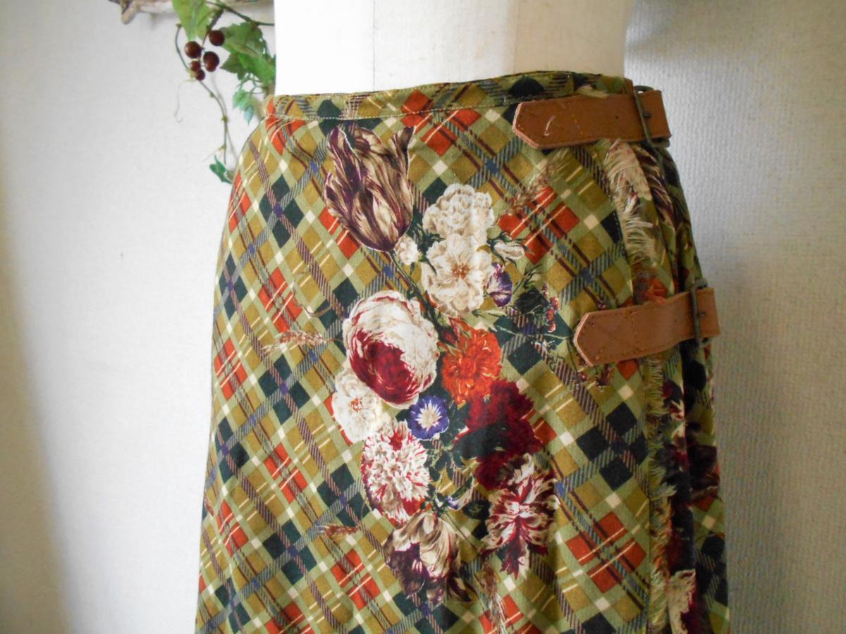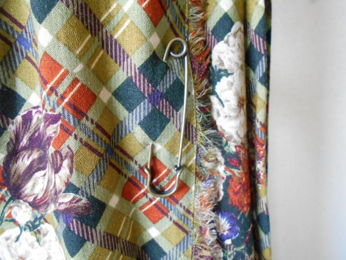 【ポイント】インゲボルグの巻スカートになります。お色はグリーン系ベースで、チェックとお花の柄が全体に入っています。前の重ねる部分以外にはプリーツが使用されていて、インゲボルグやピンクハウスでは定番的なデザインのスカートです。