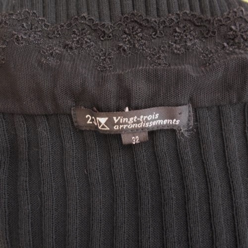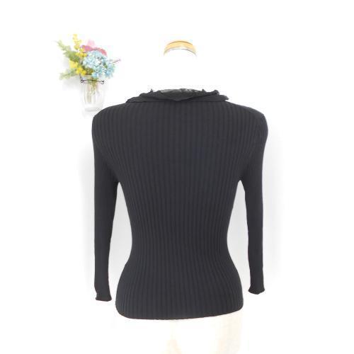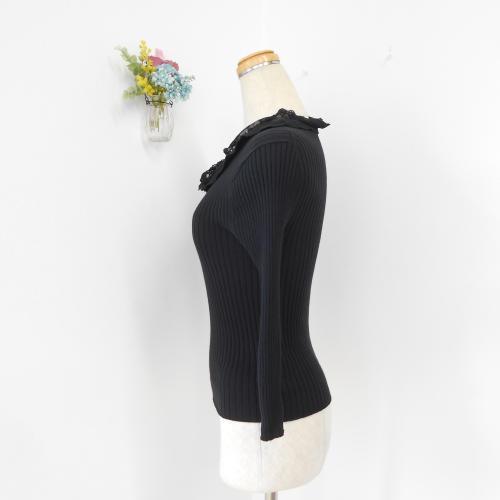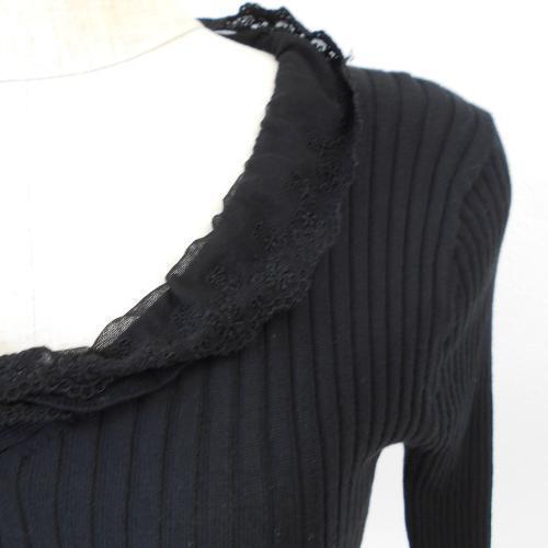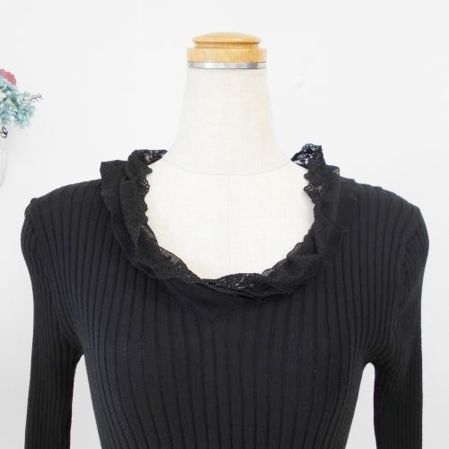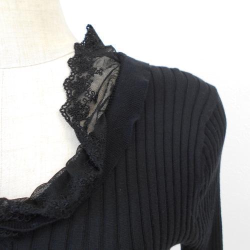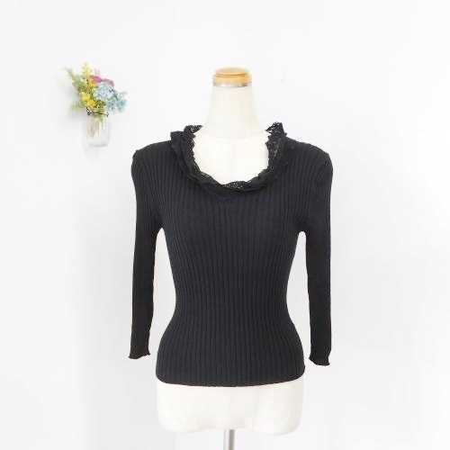 23区 ニジュウサンク オンワード 樫山 レディース 小さめ・細い方向きの七分袖リブニットのトップスです。お首に綺麗なレースが付いています。お色は黒・ブラックです。色んな用途で着て頂けそうです。