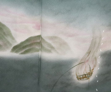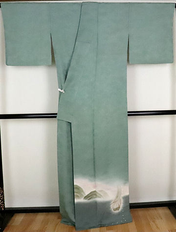 | 友禅 色留袖・訪問着 袷 丹後縮緬地 緑まだら地 手書き友禅遠山にかがり火 174 広襟 一つ紋 | |