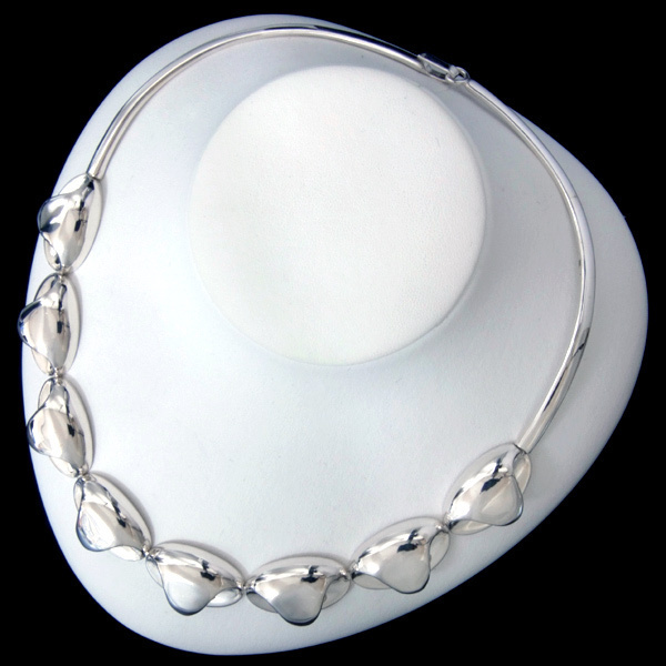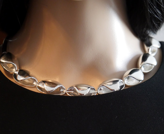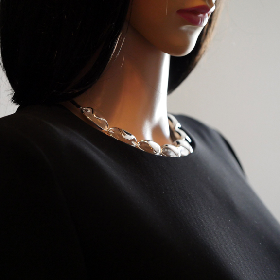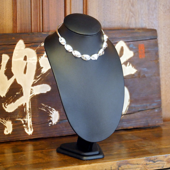 この作品は、もはや富の象徴ではなく、「内面的な豊かさ」の表現です。古代ローマの胸飾りや、中世の厳格な装飾性から離れ、現代の身体に寄り添うように設計されました。このネックレスが首元を飾るとき、それは重さではなく、「第二の皮膚」、光と影を纏う流体的な彫刻として機能します。