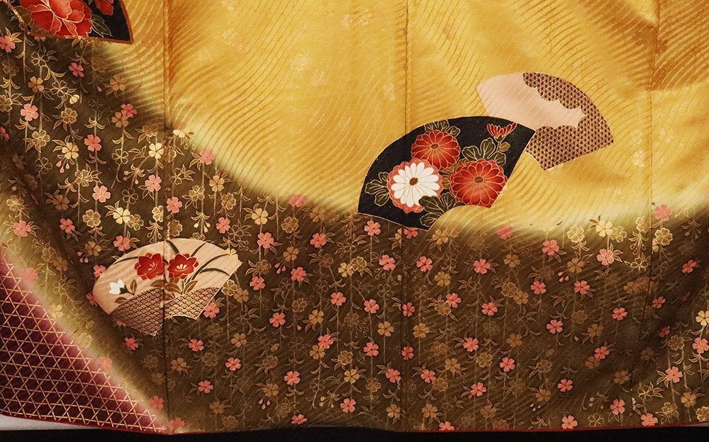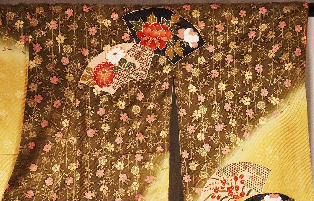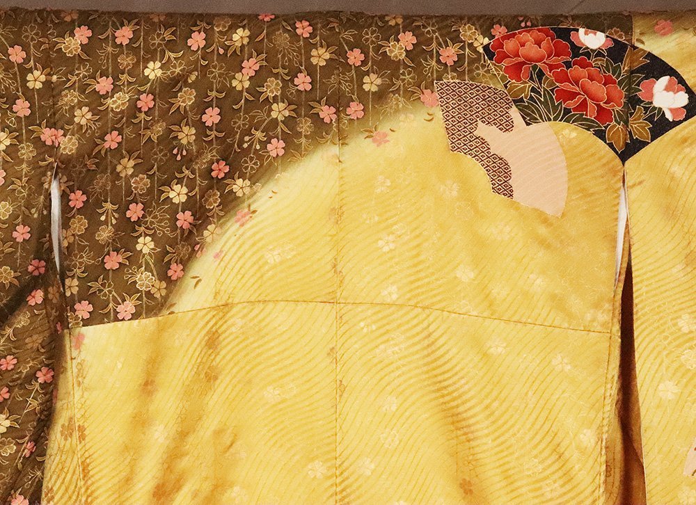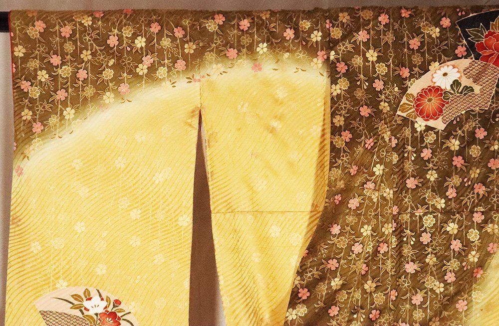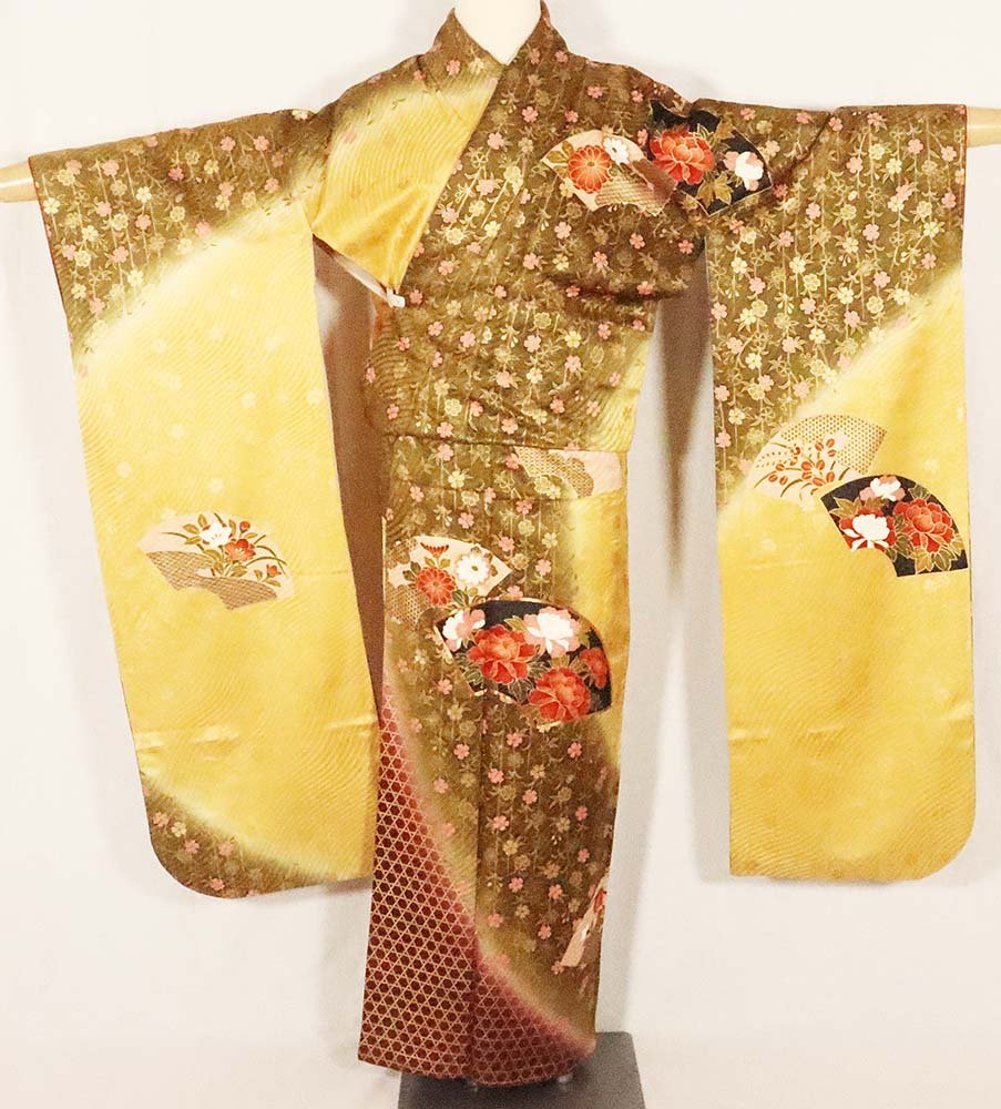 | 振袖 袷 丹後縮緬地 緑・黄土色暈し・流線綸子地 枝垂れ桜・菊・牡丹・萩・桔梗・扇文 162 広襟 | |