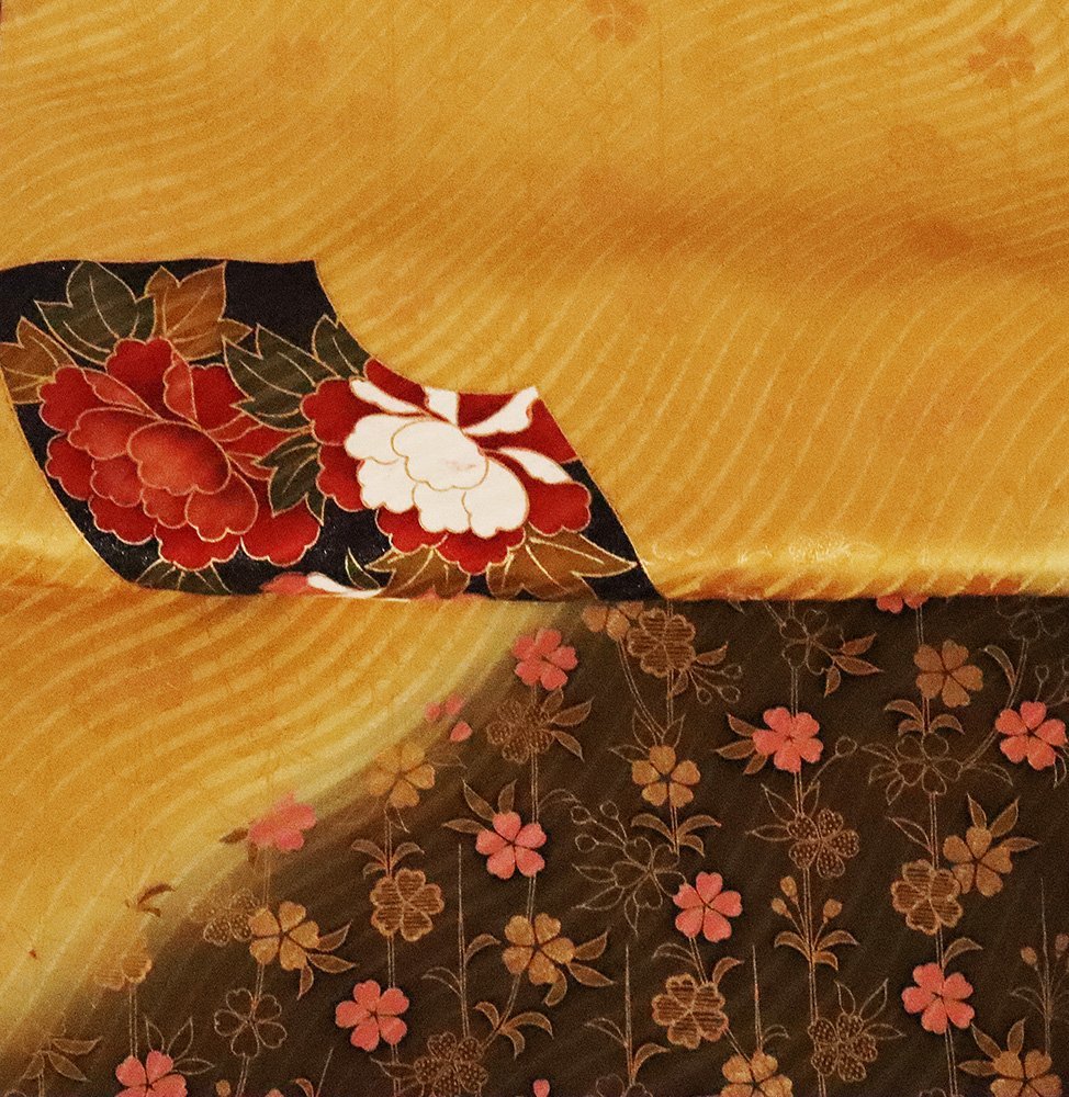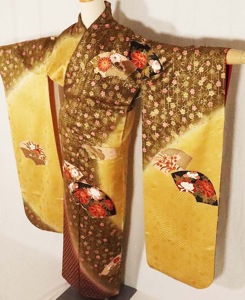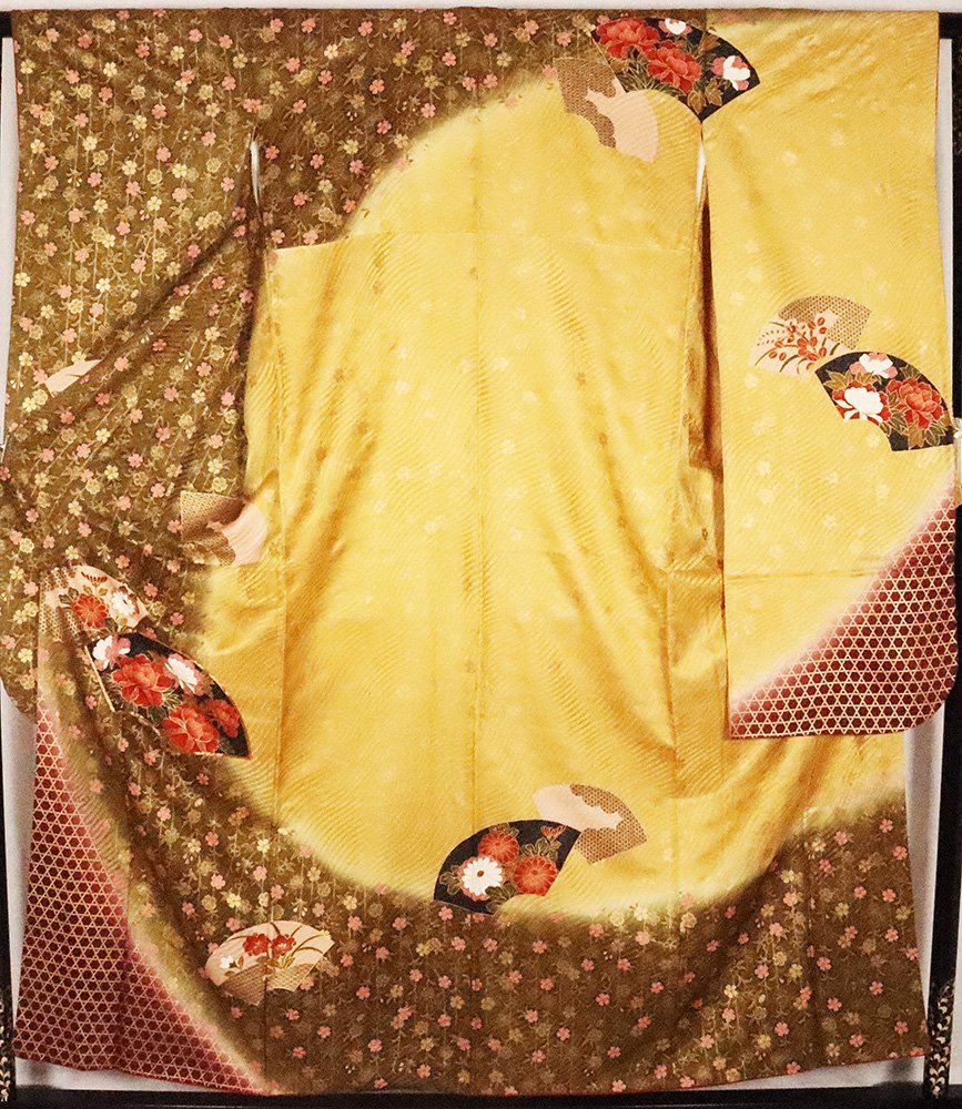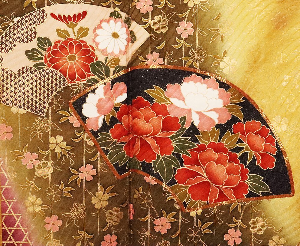 | 色・柄 | 振袖 袷 丹後縮緬地 緑・黄土色暈し・流線綸子地 枝垂れ桜・菊・牡丹・萩・桔梗・扇文 (写真では上手く色が出ない場合があります。ご了承下さい) 写真の枚数が多いので一度パソコンでご覧ください。 |
