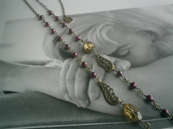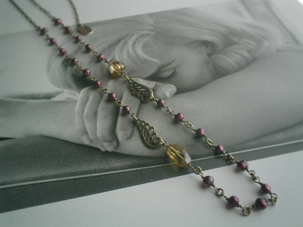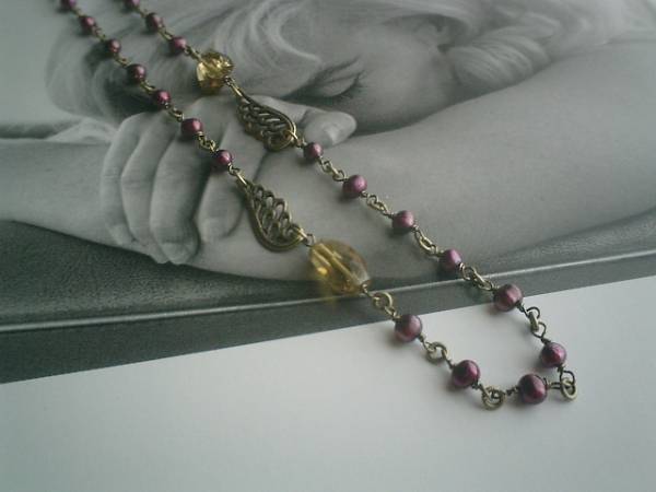ジャンヌの手仕事・・シリーズです♪秋のクローゼット・・ロマンチックな淡水パールとレモンクォーツのネックレスです♪可憐な素材を集めて大人のロマンチックしています♪♪シックなダークレッドの淡水パールは5ミリ位のポテトです♪13ミリ位のレモン水晶のタンブルカットとクラシカルなチャームを合わせてアンティークモダンな表情です♪長さは全長72センチ位で調節自由です♪チョーカー風にされてもブレスにされても素敵です♪お揃いのネックレスやブレスレットやピアスも出品しています♪♪シンプルで飽きのこないいつまでも着けられるデザインを考えて作りました!ハンドメイドをご理解頂いてノークレーム、ノーリターンでお願いします
