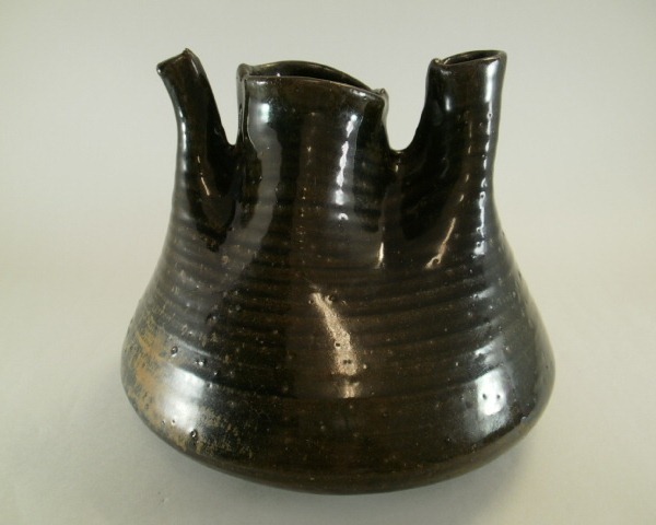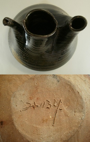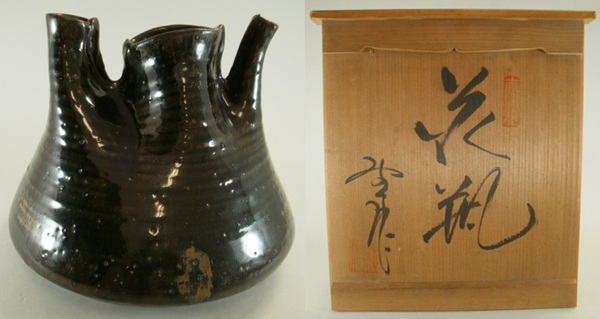 ■赤津焼 寺田みのる作 黒釉花瓶■(幅約200mm,高さ約160mm) ユニークな形の花瓶です。目立ったダメージは特にありません。 中古品ですので、その点充分ご理解の上ご入札お願い致します。 |