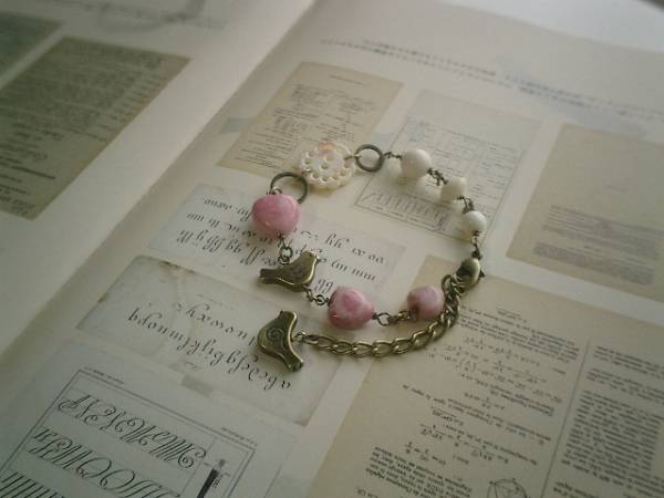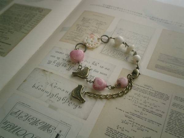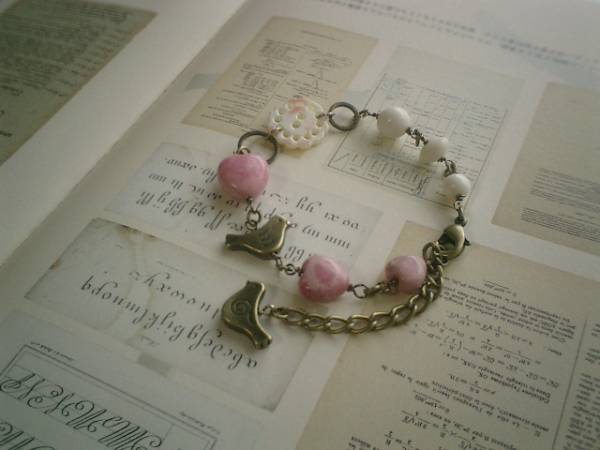 アートモダン・コレクション・・シリーズです♪春の気配・・ロードナイトと小鳥さんのキュートなブレスレットです♪やさしい色でまとめて可憐にロマンチックしています♪8ミリ、10ミリ、12ミリの大きさ違いのハートのロードナイトに6ミリ、8ミリの丸玉や8ミリのディスクなどデザイン違いのボーンやレース模様の透かしシェルや小鳥さんのメタルチャームやデザインチェーンを合わせてアートモダンな表情です♪長さは全長23センチ位で調節自由です♪♪お揃いのネックレスやピアスも出品しています♪♪シンプルで飽きのこないいつまでも着けられるデザインを考えて作りました!ハンドメイドをご理解頂いてノークレーム、ノーリターンでお願いします