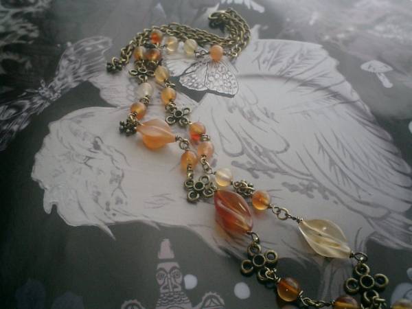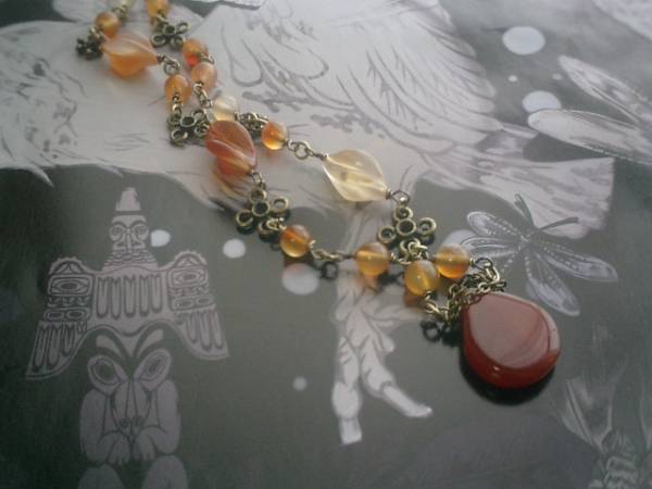秋色・デッサン・・シリーズです♪オレンジ・ブラウン系・・シックな秋色のネックレスです♪深いオレンジ、キュートなオレンジ、やさしいベージュ、様々な色合いがキュートなカーネリアンのネックレスです♪6ミリの丸玉や20×9ミリのツイストナツメのカーネリアンにお花のメタルチャームを合わせて可憐な表情です♪トップはチェーンでおめかしした20×15ミリ位のカーネリアンのマロン型です♪長さは全長70センチ位で調節自由です♪チョーカー風にされても素敵です♪♪お揃いのブレスレットも出品しています♪シンプルで合わせやすいデザインを考えて作りました♪ハンドメイドをご理解いただいてノーリターン、ノークレームでお願いします♪