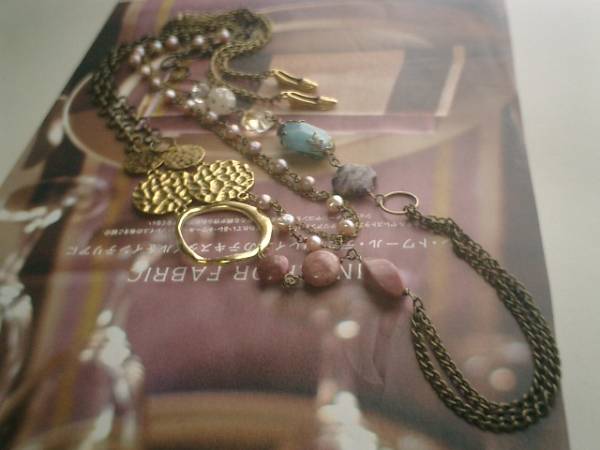 アートモダン・コレクション・・シリーズです♪キュートな色を集めたネックレス2本セットです♪6ミリ位のポテトの淡水パールはやさしいモーヴピンクです♪22ミリ、15ミリの大きさ違いのデザインチャームやデザインチェーンを合わせてシックにロマンチックしています♪長さは全長75センチ位で調節自由です♪2連にされてもブレスにされても素敵です♪長い方のネックレスは10ミリ、12ミリのコイン、16×8ミリのツイストオーバルのロードナイト、8ミリのランダムカットの水晶、11ミリのドットのトンボ玉、15ミリのラフカットのシトリン、15ミリのフラワーカットのチャロアイト、24×14ミリ位のラフカットのアマゾナイトに22ミリ、15ミリのデザインチャーム、30×35ミリ位のデザインリング、デザインチェーンを合わせてアートモダンしています♪長さは全長88センチ位で調節自由です♪2連にされても素敵です♪それぞれ単品でも出品しています♪シンプルで飽きのこないいつまでも着けられるデザインを考えて作りました!ハンドメイドをご理解頂いてノークレーム、ノーリターンでお願いします