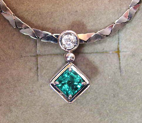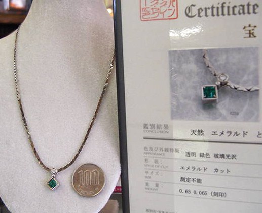 【総重量=13.8g・ペンダントサイズ=縦15.11㎜・横8.65㎜・厚さ5.01㎜・エメラルドのサイズ=約5.0㎜の正方形・ネックレス長さ=40㎝・ネックレスの巾=2.1㎜・ネックレスの厚み=1.02㎜】*参考市場定価¥50万円位。*本物・鑑別書付き。