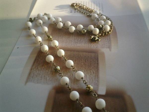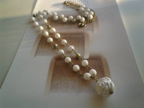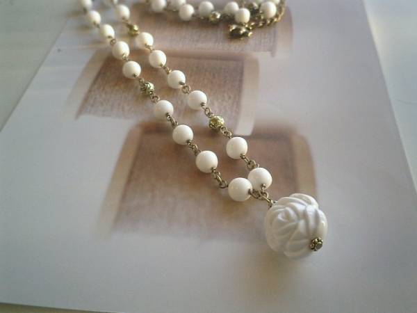 アート・ロマン主義・・シリーズです♪やさしい白の薔薇のネックレスです♪アンティークの樹脂ビーズの8ミリの丸玉にトップは20ミリの白の両面樹脂薔薇です♪薔薇のメタルチャームを合わせて可憐な表情です♪軽いので長く着けていただけます♪長さは全長90センチ位で調節出来ます♪お揃いのブレスレットも出品しています♪♪シンプルで飽きのこないいつまでも着けられるデザインを考えて作りました!ハンドメイドをご理解頂いてノークレーム、ノーリターンでお願いします