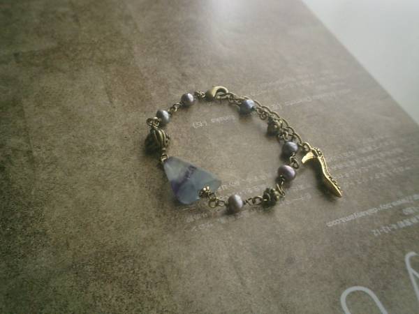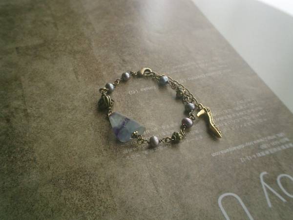 妖精のため息・・シリーズです♪儚げなフローライト・・神秘的なフローライトのブレスレットです♪18ミリ位のラフタンブルカットのフローライトに6ミリ位のパープルグレーのポテトの淡水パールを合わせました♪ナチュラルなカットが神秘的なフローライトにデザインメタルを合わせてアートな表情です♪長さは全長23センチ位で調節自由です♪お揃いのネックレスやブレスレットも出品しています♪♪シンプルで長く着けていただけるデザインを考えて作りました♪ハンドメイドをご理解頂いてノークレーム、ノーリターンでお願いします