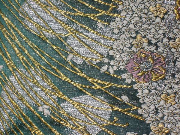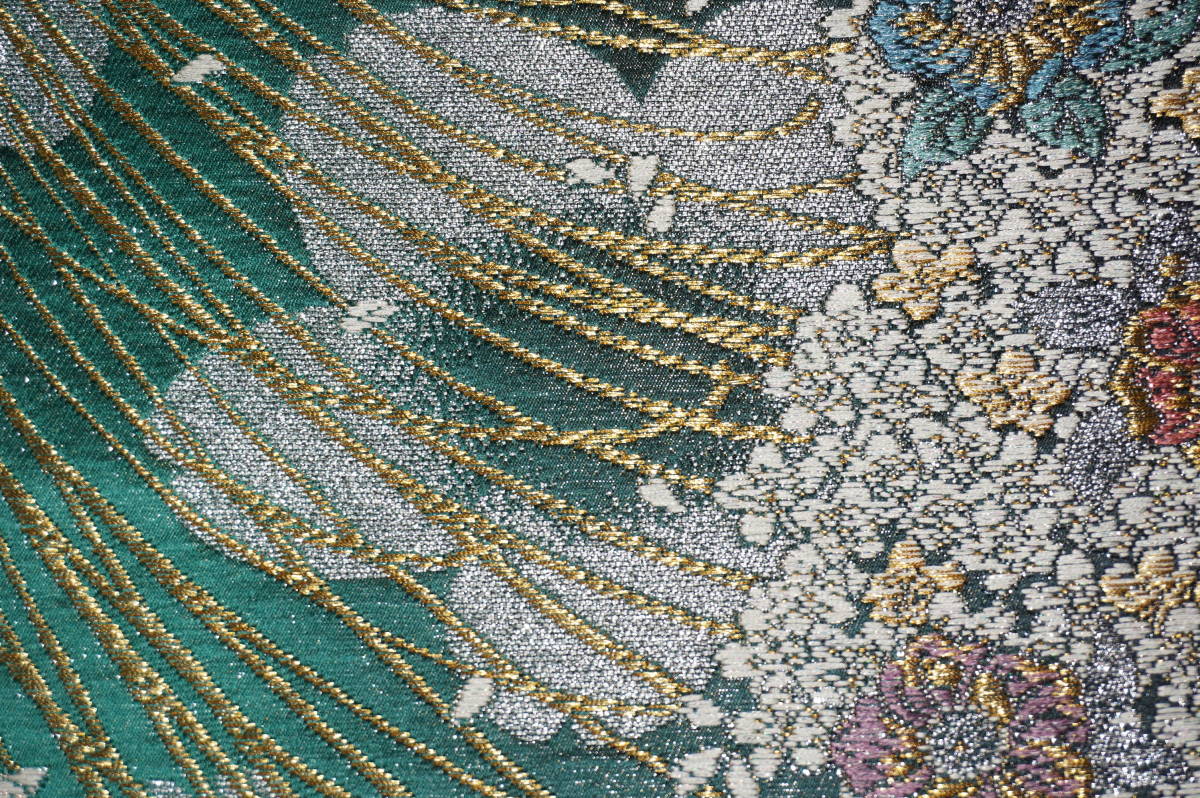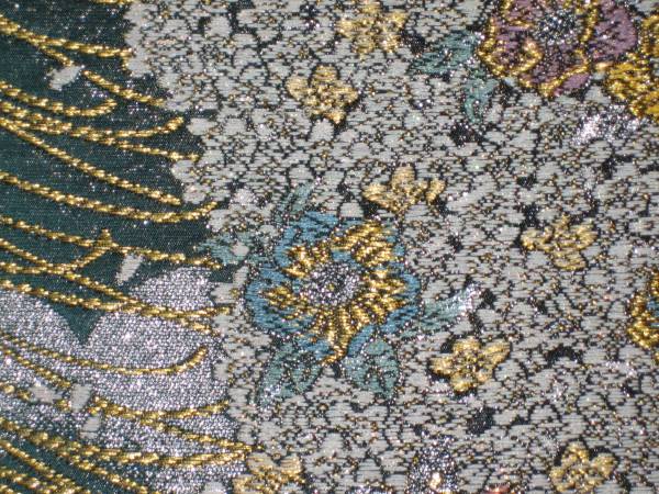 なお、帯柄左上に無地で出ているところは裏無地で、柄と柄の間に出ているところは手先と前太鼓のあいだの無地部分です。六通柄です。金銀糸が多用されているためストロボの照りで、しろぽく写っている部分があります