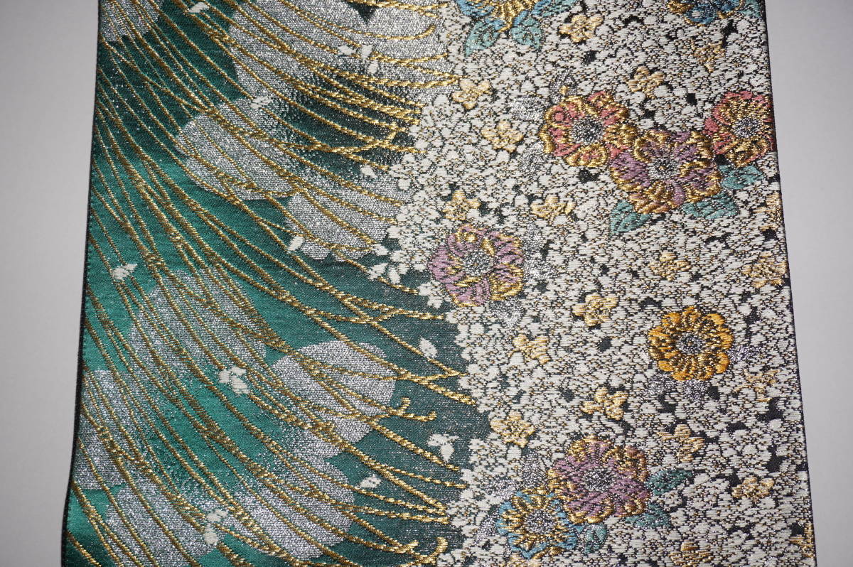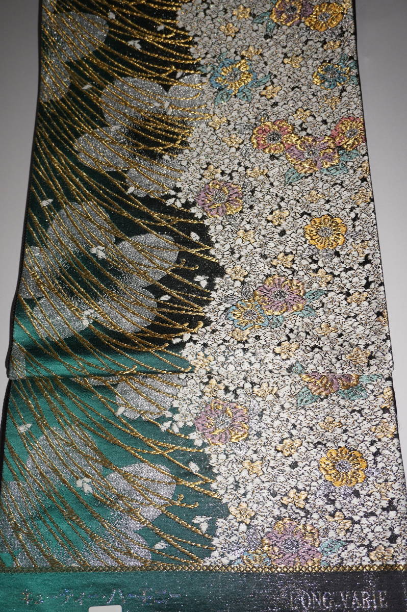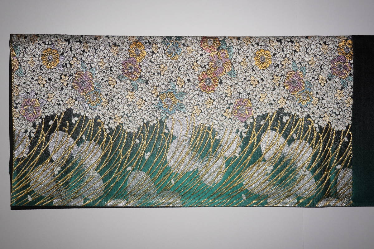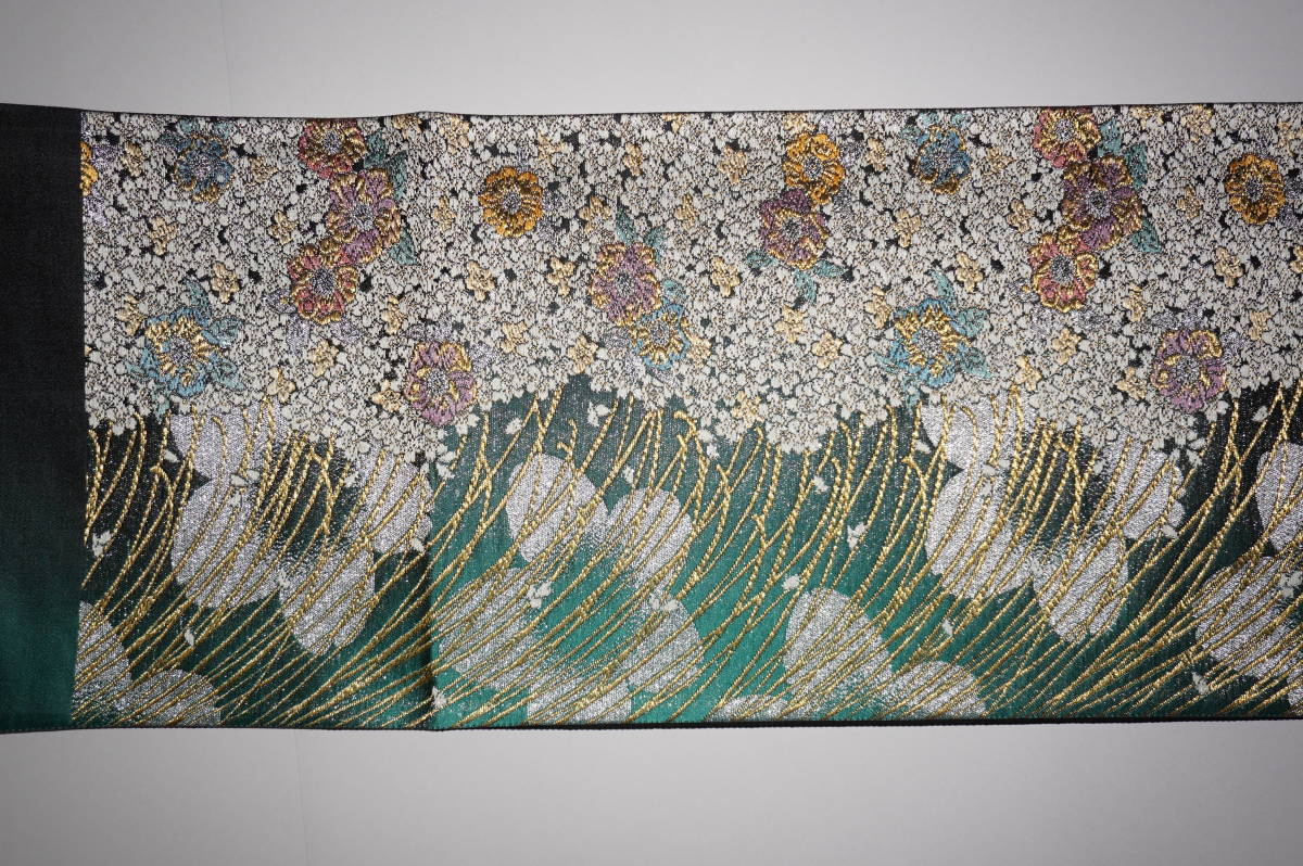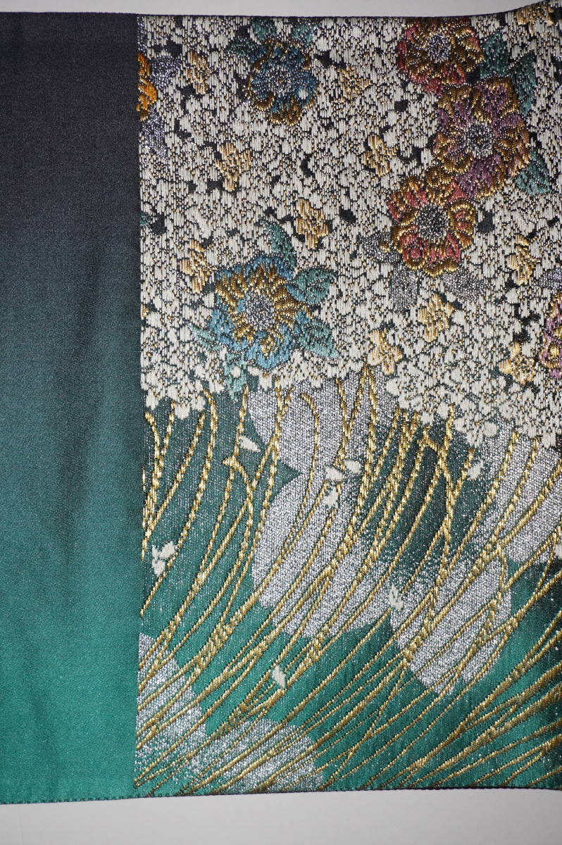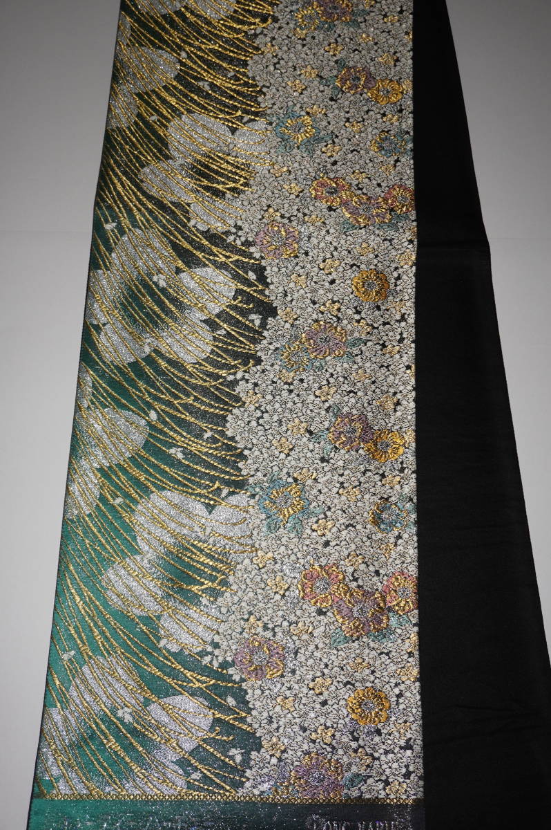 (ロングサイズ)仕立てつき振袖用帯 西陣6通柄袋帯 緑~墨地(裏地黒) 絹100%(金属糸等使用)  新品み仕立て品ですがこのお値段で仕立てつきで、納品です。なお、最終日まで待っていただかなくとも、入札した時点でオークションは終了し落札者となります。お値段的にもお安く設定いたしましたお買い得品です(西陣帯です)。もちろん芯込みの仕立て付きですが、仕立てなしの場合でも金額は変わりません。