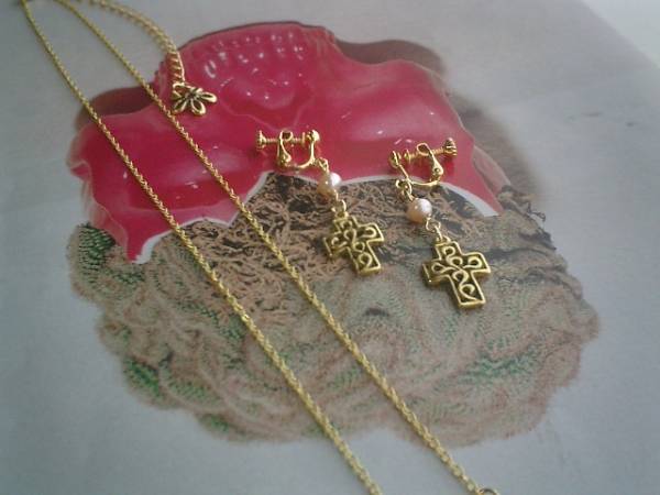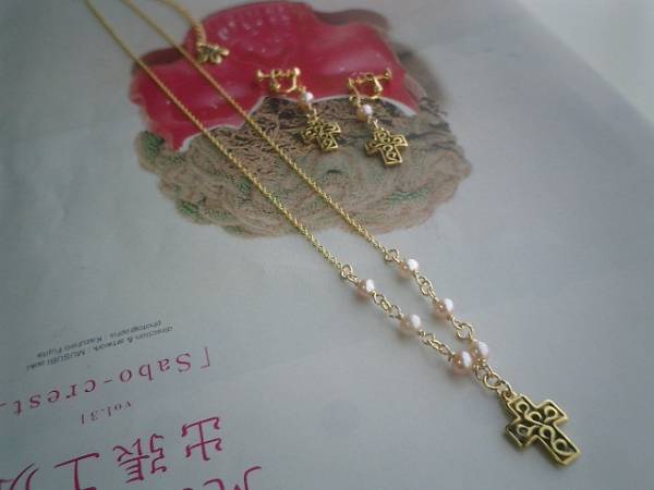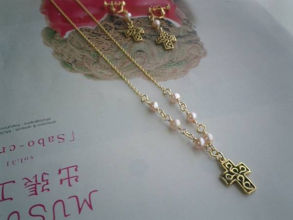 後ろボタンのワンピース・・シリーズです♪パール見本帖・・キュートな淡水パールの2点セットです♪ネックレス、イヤリングの2点セットです♪シックなクロスチャームを合わせてキュートモダンな表情です♪5ミリ位のポテトの淡水パールに13×18ミリ位のクロスチャームを合わせました♪ネックレスの長さは50センチ+アジャスター10センチで最長60センチ位です♪イヤリングは全長4・5センチ位です♪ピアスに変更出来ます♪それぞれ単品でも出品しています♪♪シンプルで飽きのこないいつまでも着けられるデザインを考えて作りました!ハンドメイドをご理解頂いてノークレーム、ノーリターンでお願いします