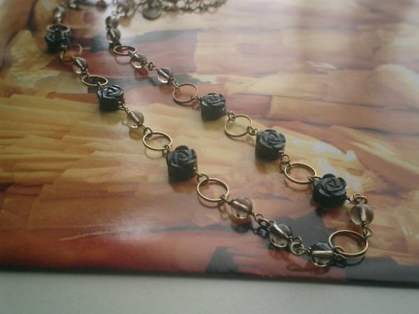 妖精のため息・・シリーズです♪薔薇と薔薇の間に・・シックなオニキスの薔薇とスモーキークォーツのネックレスです♪10ミリのオニキスの両面薔薇に繊細な6ミリのスモーキークォーツの丸玉を合わせて可憐な表情です♪長さは全長74センチ位で調節自由です♪♪お揃いのブレスレットやピアスも出品しています♪♪シンプルで飽きのこないいつまでも着けられるデザインを考えて作りました!ハンドメイドをご理解頂いてノークレーム、ノーリターンでお願いします