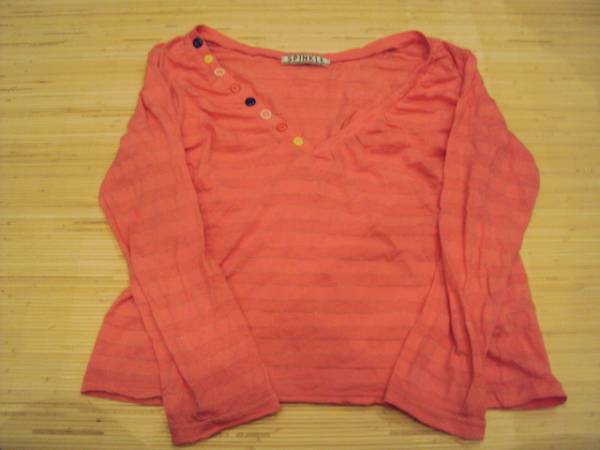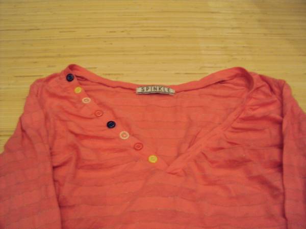 東京の可愛いお店で購入した、可愛いピンクの生地にシルバーの細いボーダーが入った長袖トップスになります。サイズの方は、Mサイズです。画像3にもございますように、後ろのタグの下に、はじめから商品タグの小さな穴がございます。髪の毛で目立ちにくくはなるかと思いますが、ご理解頂ける方に限らせて頂きたいと思います。器用な方でしたら手芸用の瞬間接着剤で留めて頂いたり。糸で補修して頂けるかも知れませんが、当方、不器用な方ですので、現状のままお渡しさせて頂きたいと思います。右上部分に並んだ色々な形をしたボタンがポップでとても可愛いです。全体的に上品なデザインになりますので、パンツにもスカートにも合わせやすいです。当方、ただいま引越しの準備に伴う、荷物の整理を行っております。どうぞ宜しくお願い致します^^*