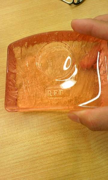 重量感のある淡い赤のガラスに時計をはめ込むタイプです。