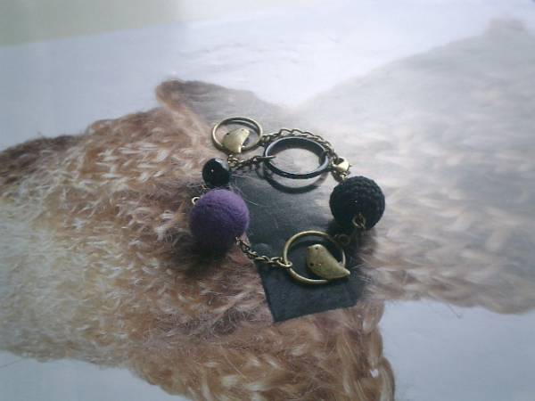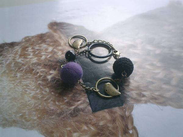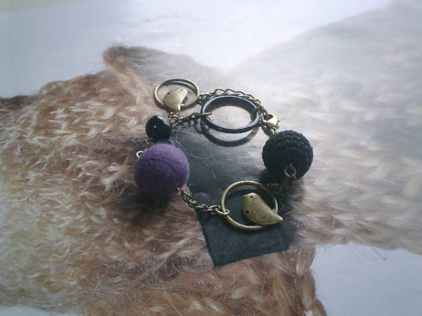 個人的創作ノート・・シリーズです♪恋する小鳥さん・・シックな黒とパープルでまとめたキュートなブレスレットです♪オニキスは8ミリの丸玉や22ミリ位のリングです♪15ミリの黒の編みボールやダークパープルのフェルト玉や18ミリ位の小鳥さんのリングチャームを合わせて大人のロマンチックしています♪長さは全長23センチ位で調節自由です♪お揃いのネックレスやピアスも出品しています♪シンプルで飽きのこないいつまでも着けられるデザインを考えて作りました!ハンドメイドをご理解頂いてノークレーム、ノーリターンでお願いします