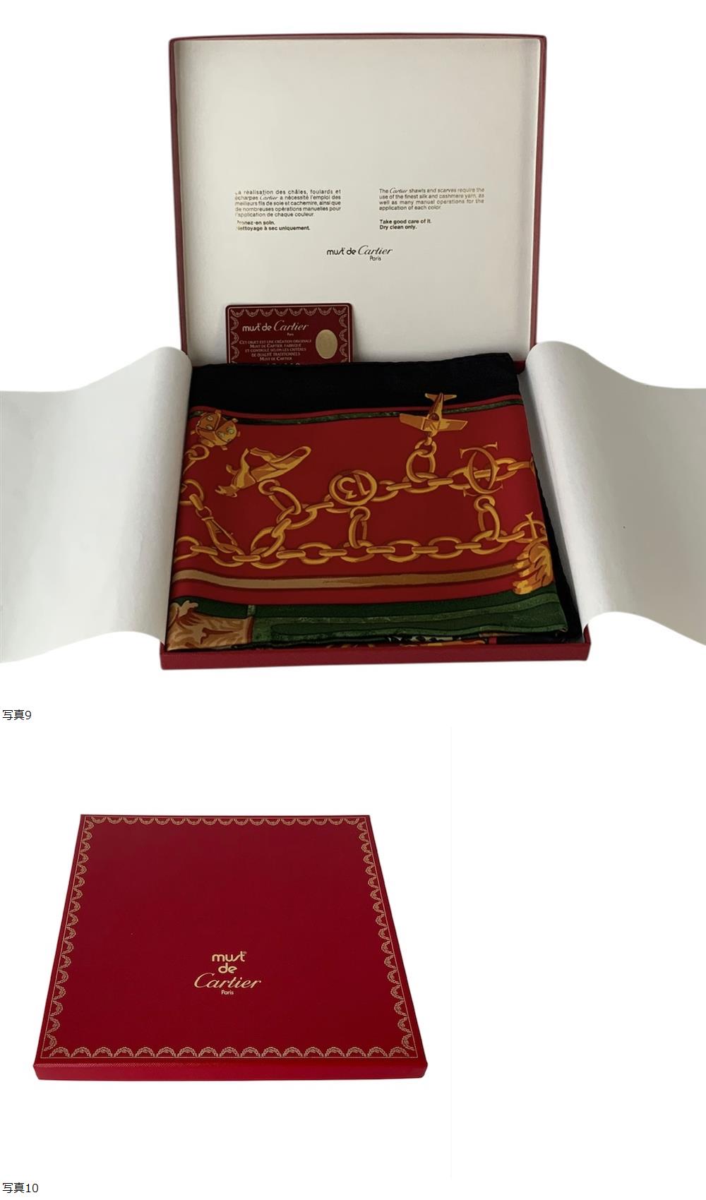 IY-5461 ☆ 1円スタート ☆ Cartier カルティエ マストドゥカルティエ スカーフ レッド グリーン ブラック マルチカラー シルク レディース