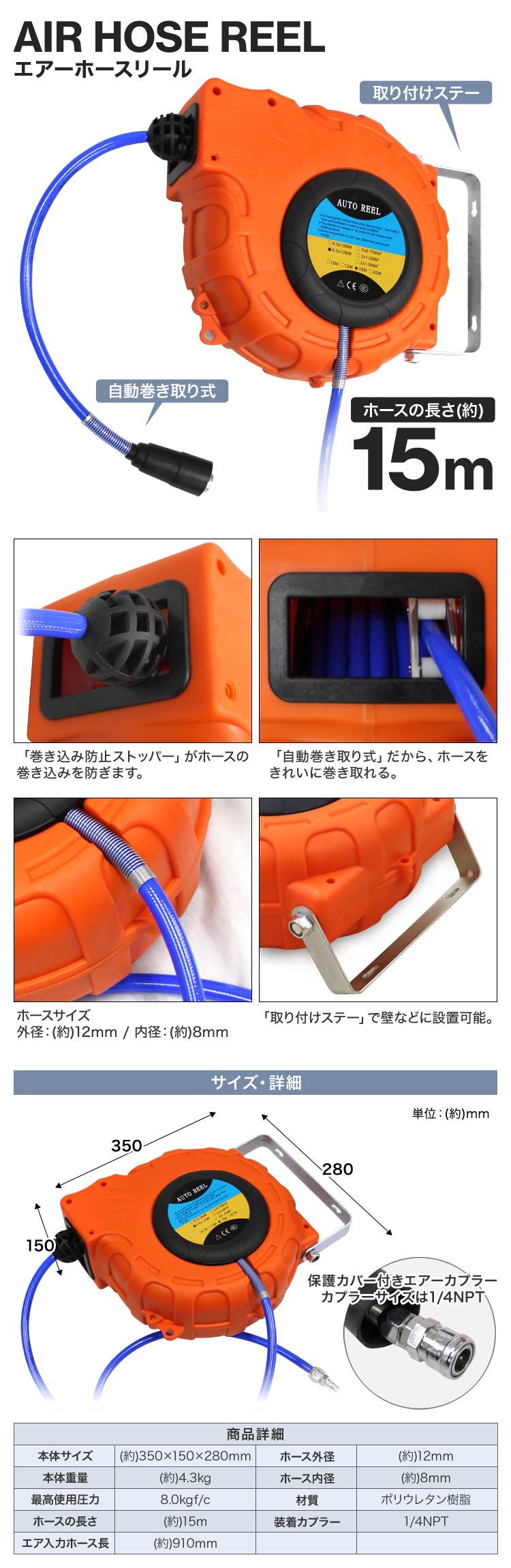 お問い合わせの多かった、エアーコンプレッサーをついに入荷! エアーホースリールとのセット商品です。 ●エアーコンプレッサー ・最高圧力は0.8Mpa! ・タンク内圧力を一目で確認! ・ハンドル付きで運搬しやすい! ・ワンタッチカプラーで簡単取り付け! ・過圧力自動停止機能付き! ・家庭用電源で使用可能 ・誤開放しにくい手回し方式のドレインコック付き 【商品仕様】 サイズ(約):幅330×奥行560×高さ585mm 重量(約):19kg 電源コードの長さ(約):1.3m 電源:AC100V 50/60Hz 出力:1.5KW/1HP 消費電力:1200W タンク容量:25L 最高圧力:0.8MPa/115psl 再起動圧力:0.55MPa/75psl 無負荷回転数:2850RPM(50Hz)/3360RPM(60Hz) 吐出空気量:130L/分 連続使用時間:約1時間(タンク内を満タンに貯めてから使用した場合) 騒音レベル:80dB 【商品内容】 ・エアーコンプレッサー本体 ・フィルターキャップ ・エアークリーナー ●エアーホースリール 【商品仕様】 ・最高使用圧力:8.0kgf/c ・ホースの長さ:約15m ・エアー入力ホース長さ:910mm ・ホースの外径:12mm ・ホースの内径:8mm ・材質:ポリウレタン樹脂 ・装着カプラー:1/4NPT ・本体サイズ:幅350×奥行150×全高280mm ・重量:4.3kg |