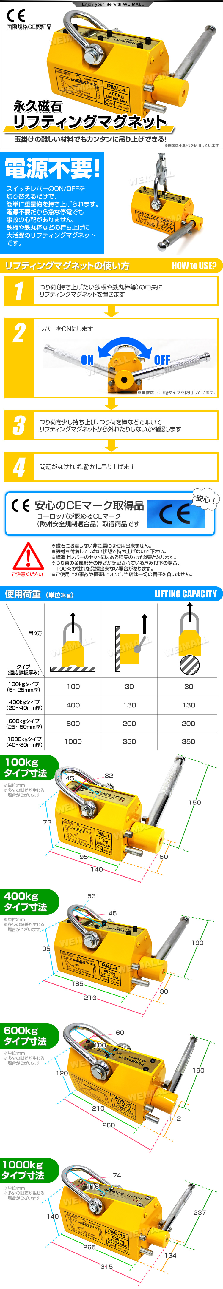 永久磁石リフティングマグネット(リフマグ)。 国際規格CE認証品です。 玉掛のむつかしい材料でも簡単に吊り上げることが可能! ★電源不要★ ・スイッチレバーのON/OFFを切り替えるだけで簡単に重量物を持ち上げられます。 ・電源不要だから急な停電でも事故の心配がありません。 ・鉄板や鉄丸棒などの持ち上げに大活躍のリフティングマグネットです。 【仕様】 最大吊上荷重 :400kg 本体サイズ(約):210×90×95mm 本体重量(約) :9kg 【注意事項】 ・鉄板厚みは20-40mm以内で使用してください。 ・リフティングマグネットは鉄材に接着させた状態で作動します。 鉄材に接着していない状態では、磁場の関係でレバーをONにすることができません。 また、リフティングマグネットが鉄材に接着していない状態で無理にONにすると、リフティングマグネット本体の故障につながる可能性がございますので注意して下さい。 ・吊り上げる際は必ず吊り荷を少し持ち上げ、吊り荷を棒などでつついて、リフティングマグネットから外れないか確認してから吊り上げて下さい。 ・最大吊上荷重以内で使用してください。 ・最大吊上荷重以内でも材質や接着面の状態などによっては吊り上げられない場合があります。 ・強力な磁気を発しますので、腕時計や磁力に弱い精密機器等は近づけないでください。 |