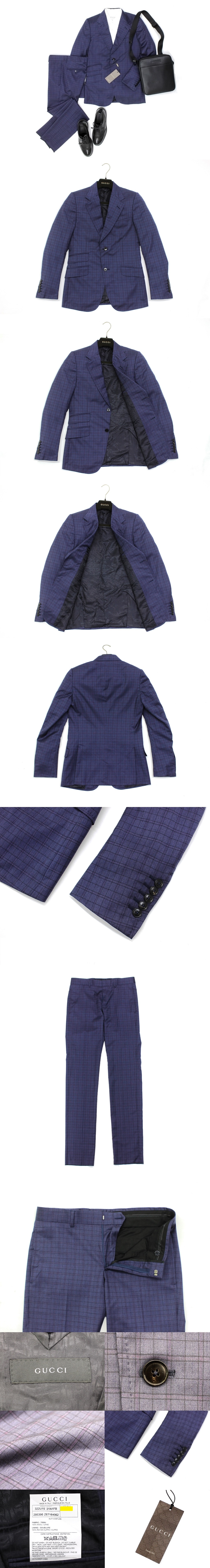 65万新品◆46=S◆GUCCI グッチ 格子チェック柄 ホースビット ウール100%スーツ ネイビー
