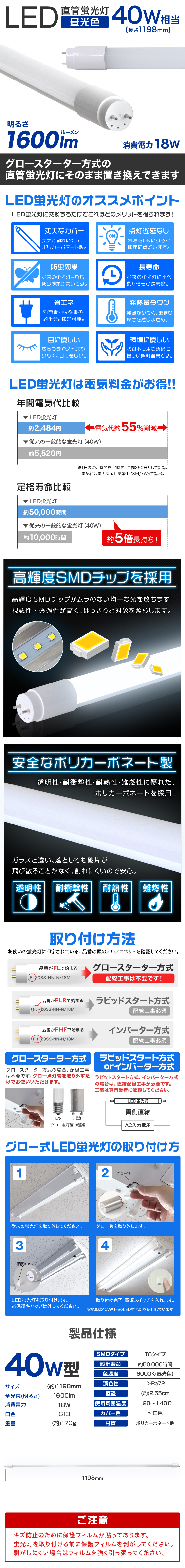 安心の1年保証付き! 高性能高輝度LED(SMD)を使用!驚異的な明るさを実現! 40W形 直管LED蛍光灯です。 工事無しで簡単取り付け可能! 今までネックになっていた配線工事を必要としないタイプです。 ◇当店のLED蛍光灯の特徴◇ 従来の蛍光灯と比べて、長寿命で約5倍長持ち。 低消費電力、省エネで電気料金を大幅削減。 放熱部はアルミニウム合金製で、放熱性が更に向上、軽量化。 本体部はポリカーボネート樹脂+合金製で、割落・飛散しにくい。 (ポリカーボネートは、防弾ガラスに採用されている強度の高い素材です。) 美しい昼光色でお部屋を明るく照らします! 【商品仕様】 直管LED蛍光灯 40W形 ×25 サイズ:全長(約):1198mm 直径(約):25.5mm 全光束(明るさ):1600lm 消費電力:18W 口金:G13 重量:(約):170g SMDタイプ:T8 設計寿命:(約):50,000時間 ※LED商品は一般的に長寿命とされておりますが、使用環境により異なる場合がございます。 色温度:6000K(昼光色) 演色性:>Ra72 使用周囲温度:-20~+40℃ カバー色:乳白色 材質:アルミ/ポリカーボネート 保証期間:7日間 ※商品到着後7日以内の初期不良・破損のみご対応させていただきます。 【注意事項】 ・グロースターター方式の器具は、グロー点灯管を取り外すだけで、そのままご使用できます。 ・一般蛍光管と交換するだけでご使用できます。ただし、ひとつの灯具に一般蛍光管や他のLED蛍光灯と混ぜて使用しないでください。 ・ラピッドスタート方式、インバーター方式、電子安定器、調光できる安定器を持つ灯具、他社LED蛍光灯などのために配線加工や改造をされた灯具は使用できません。 また取り付けないで下さい。 無理に使用を続けると、動作異常となったり、灯具や本製品が故障することがあり、まれに発煙、発火に至るおそれがあります。 |