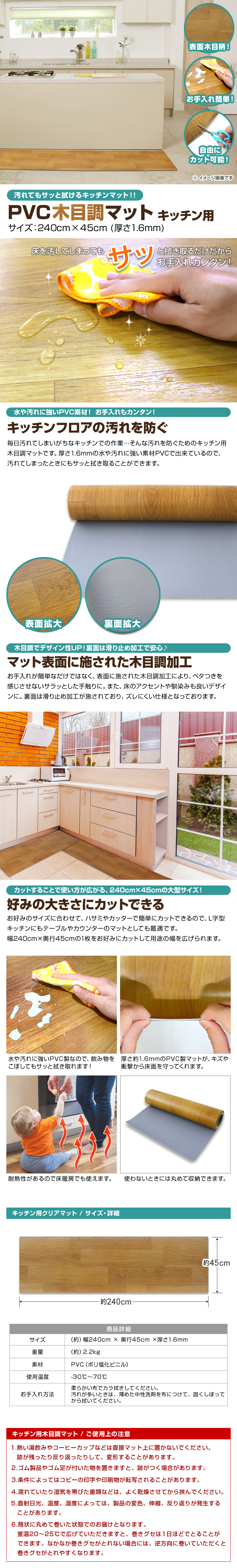 キッチン周りの床面を傷や汚れから守るキッチンマットです。 インテリアのアクセントや床に馴染みもよいデザインで、お部屋のイメージを損ねない!! 耐熱性があるので床暖房の上でも使用OK! 240cmの大型サイズで簡単にカットすることができるので、ダイニングテーブルやカウンターのマットとしても最適です! 【商品仕様】 カラー:木目調 サイズ(約):幅240cm×奥行45cm(厚さ1.6mm) 重量(約):2.2kg 材質:PVC(ポリ塩化ビニール) 使用温度(約):-30℃~70℃ 【注意事項】 ※お手入れは薄めた中性洗剤を湿らした布につけ、固く絞って拭いた後、水分が残らないように乾いた布で乾拭きしてください。 ※日の当たる所で使用しないでください。日焼けで硬化する場合があります。 |