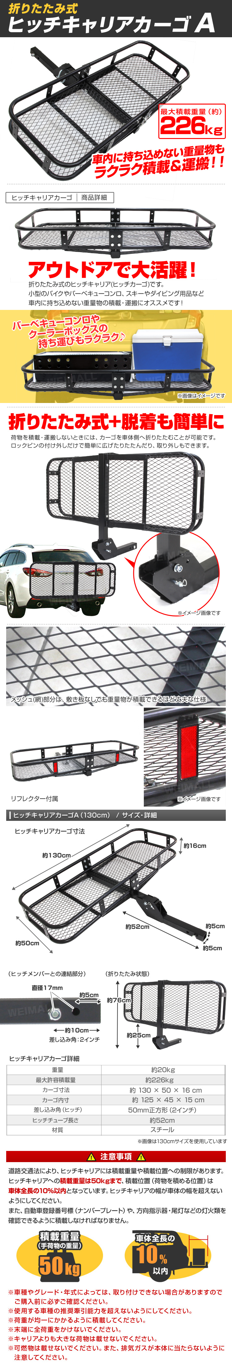 | マリンスポーツで濡れたウェットスーツやフィン、 またははクーラーボックス、バーベキューコンロなどのキャンプ用品や 汚れ物等の車内に積むには厳しい物を積むのに便利なヒッチキャリアカーゴです。 車の後ろに取り付けられます。 キャンプでも給水場に早変わり、 キーパーや水缶等の水物を置く場所として活用すると便利です♪ 本体にはリフレクターテープ付きなので、荷物を積んだ際の被視認性も問題ありません! 物を載せないときは、車体側へ折りたたむことができます。 【商品仕様】 最大許容積載量(約):226kg 荷台サイズ(約):幅130×奥行き50×厚さ16cm 素材:スチール製 ヒッチサイズ:2インチ(50mm)正方形 ヒッチチューブ長さ(約):520mm 重量(約):20kg |