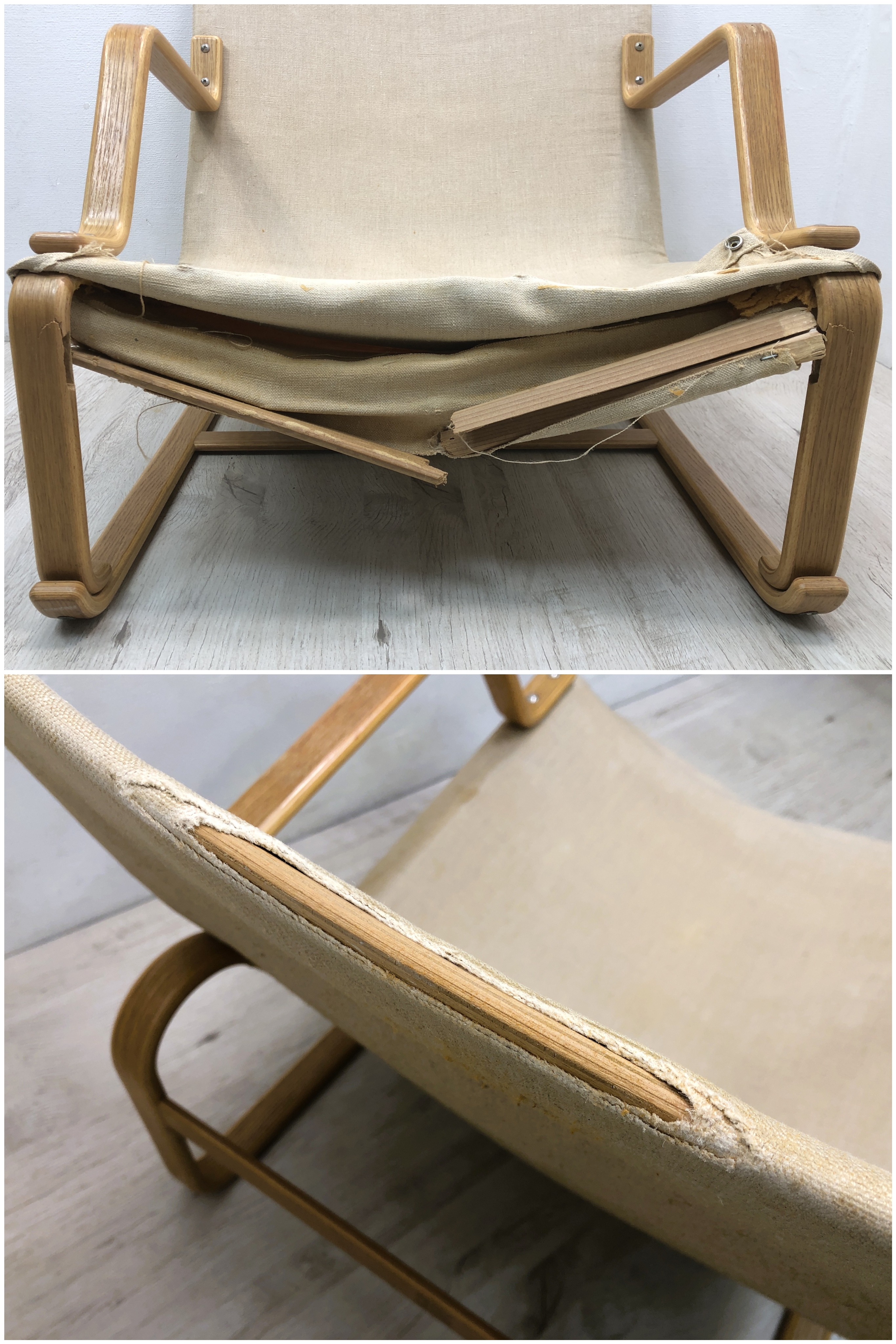 こちらはTendo 天童木工 Bruno Mathsson ブルーノマットソン Margareta マルガリータ イージーチェア です。 ジャンク品です。 スウェーデン政府よりプロフェッサーの称号を与えられた、 北欧を代表する家具デザイナー、Bruno Mathsson(ブルーノ・マットソン)。 1974年に初来日した際、日本人のためにデザインしたイスが、Margareta(マルガリータ)と呼ばれるシリーズです。 2年後に製品化し天童木工から発売され、今日まで生産されています。 マットソンデザインの特徴である流れるような曲線を描くフレームは、天童木工が得意とする成形合板によるもの。 スリムな部材でもしなやかな強さを生み出す、シンプルな構造です。 脚部には、床面との接地面積を大きくとった“床摺り構造”が採用されており、 カーペットや畳の上でも安心してお使いいただけます。 また、成形合板のフレームによって、見た目からは想像できないほどの軽さを実現しています。 1人でも持ち運びできるため、お掃除や模様替えも容易に行えます。 【Tendo/天童木工】 1940年に創業の山形県天童市に本社工場を置く家具メーカー。 戦後間もない頃から家具における「デザイン」に価値を見出し、 丹下健三や剣持 勇、柳 宗理といった日本を代表する建築家やデザイナーと共に多くの協働を重ねてきました。 良質な家具の量産を可能にする技術として誕生した成形合板を日本でいち早く実用化させたメーカーでもあり、 薄くても強度を保てる成形合板は、無垢材では出せない複雑な曲面やフォルムを可能にします。 【コンディションについて】 コンディションにつきましては、座面前面の木部フレームに破損がありますので ジャンク扱いの現状品として出品いたします。 ネジの不足箇所があり、一部代替品を使用しています。 コンディションにつきましては下記の画像も併せてご確認ください。 ![]() 【肘掛の状態】 ![]() 【前面左右の木部の破損】 ![]() 【前面木部の破損/背もたれ上部の状態】 ![]() 【座面内部の状態/クッションウレタンの状態】 同シリーズが複数入荷しております。(随時出品予定です) ![]() どうぞこの機会にいかがでしょうか! 皆様のご入札をお待ちしております。 再良市場の他のお品物はこちらから!