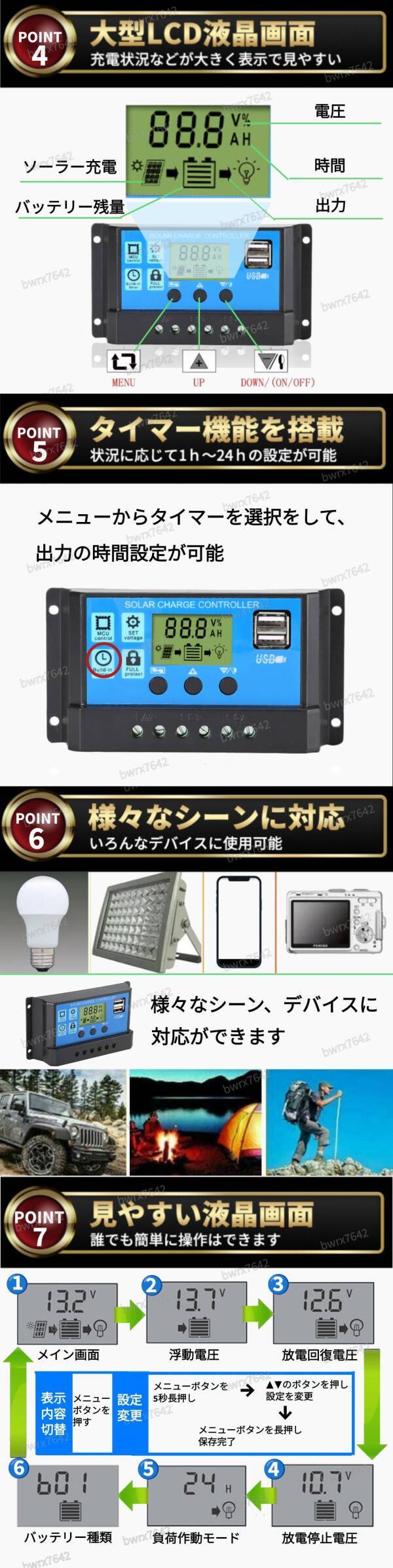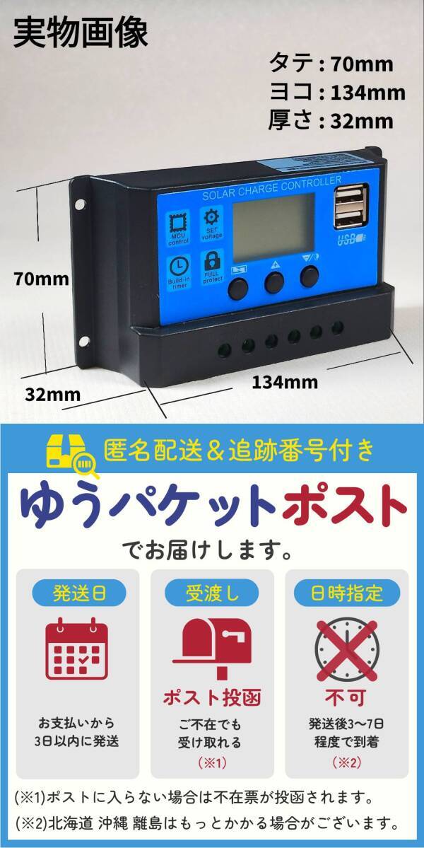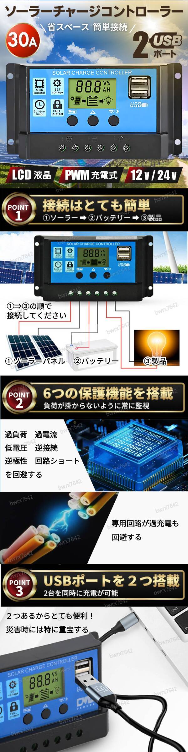 ソーラー チャージ コントローラー 30A チャージャー 12V 24V 充電 バッテリー LCD 液晶 自動調整機能 USB 太陽光 充電制御 安全 キャンプ