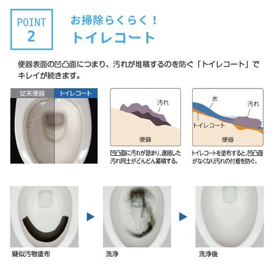 ・ 便器表面の凹凸面に詰まり、汚れが堆積するのを防ぐ「トイレコート」を採用。キレイが続きます。