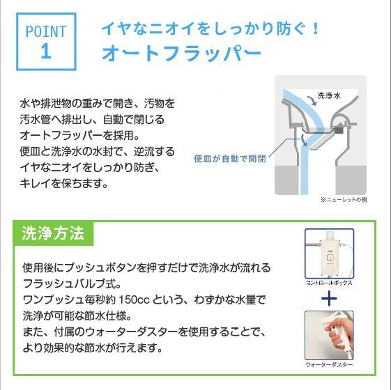 ・ 水や排泄物の重みで開き、汚物を汚水管へ排出し自動で閉じるオートフラッパーを採用。