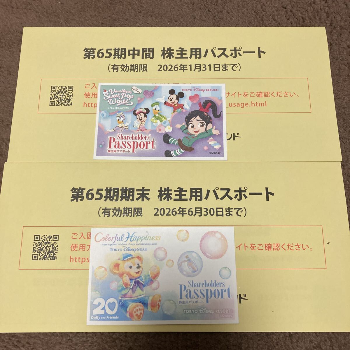 第65期中間株主用パスポート(有効期限2026年1月31日まで)1枚と、第65期期末株主用パスポート(有効期限2026年6月30日まで)1枚の合計2枚になります。