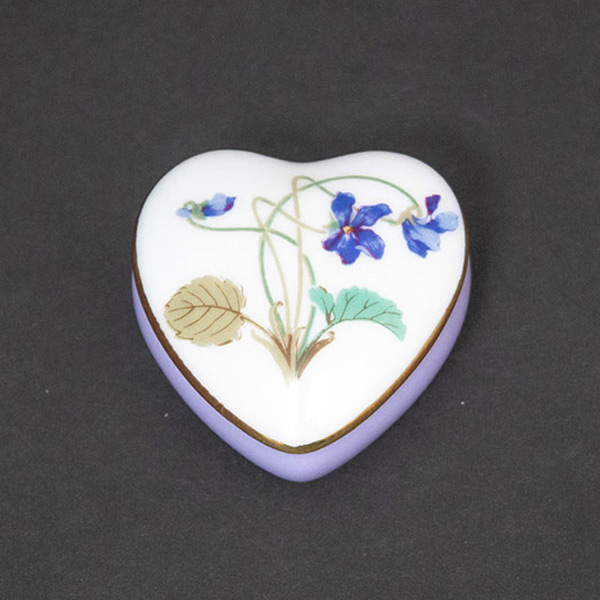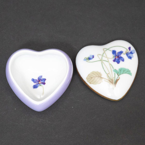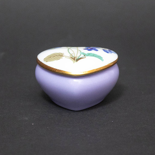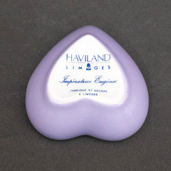 フランスのリモージュ地方の名窯、アビランドのアンペラトリス・ユージェニーのハートボックス(小物入れ)。 ナポレオン3世の皇后ユージェニーから依頼を受け、白磁に薄紫のスミレをデザインしたシリーズ。現在もエリゼ宮で使用されていいます。こちらはハート型の小さな小物入れになります。ボックスの内側にもスミレが一輪描かれています。 ■サイズ 横幅58 × 奥行56 × 高さ36mm ■付属品 なし ■状態 B(良品):特に目立つダメージのない、状態の良いお品物です。 |