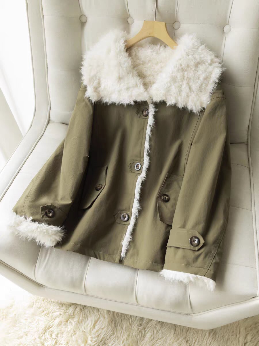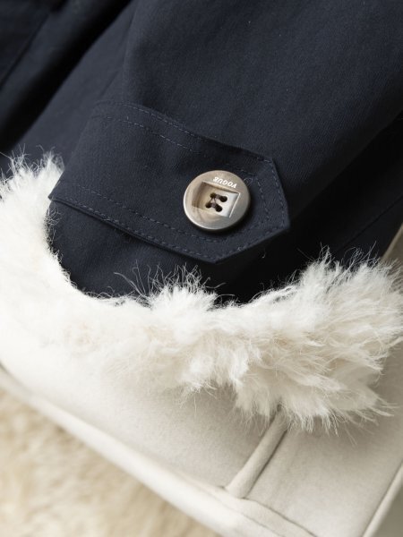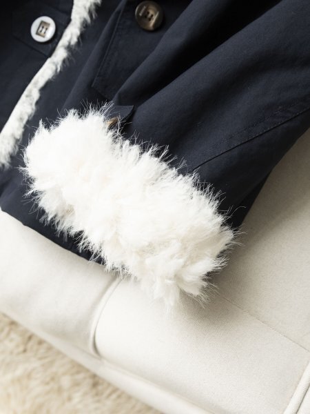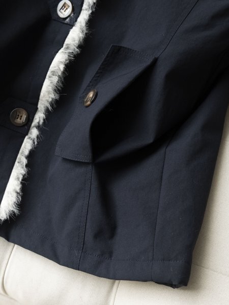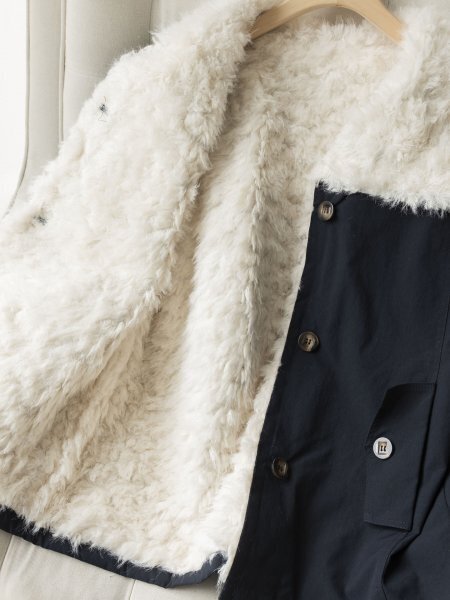 前立て、袖口や襟元には裏ボアを施し、毛足が長くて、存在感のあるスタイリッシュな雰囲気を演出します。ゆったりしたシルエットは体型カバーにも役立ち、さまざまな場面で活躍します。おしゃれな折り襟を施しているので、シルエットがさらに立体的に、シンプルながらもファッショナブルな印象に。両サイドのポケットは日常のスマホや鍵などを入れることができますのですごく便利です。