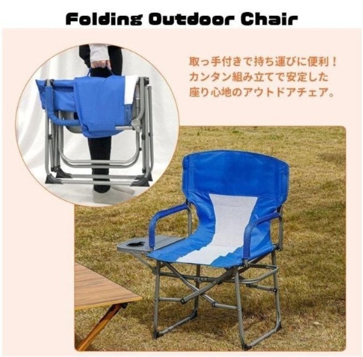 サイドテーブル付き 折りたたみ アウトドア チェア キャンプ 椅子 耐荷重 120kg テーブル付き 軽量 折りたたみチェア ブルー