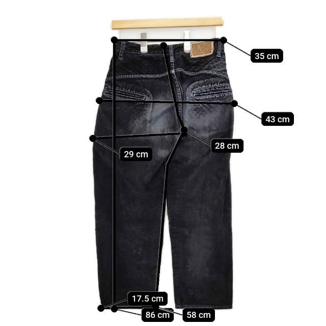 | 実寸サイズ | 総丈:約86cm ウエスト:約35cm 股上:約28cm 股下:約58cm ヒップ:約43cm ワタリ幅:約29cm 裾幅:約17.5cm ※採寸画像がある商品はハンガーに吊るした状態での計測のため、平置きでの採寸とは差が生じる場合がございます。平置きでの実寸サイズをご希望の場合は、ご購入前に必ずご質問ください。 ※記載以外のサイズが合わないことを理由とした返品はできませんので、 記載部分以外で実寸サイズの気になる箇所があれば必ず購入前にご質問ください。 |