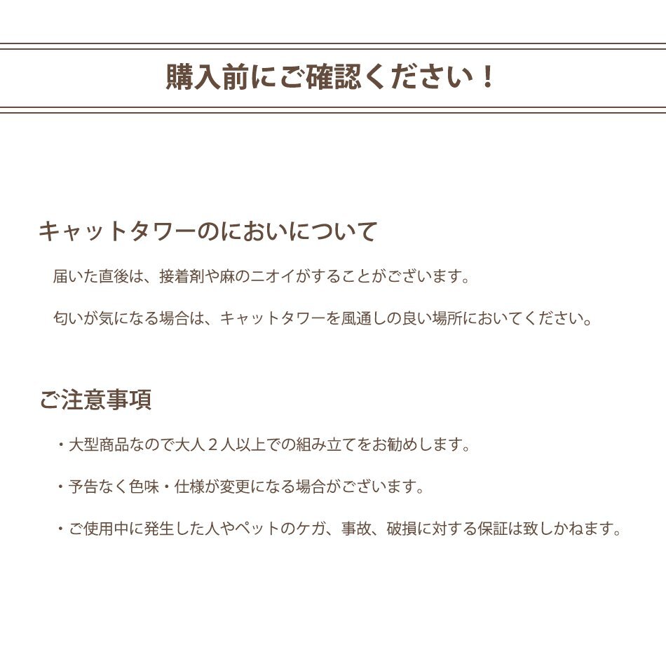 ネコちゃんの隠れ家にピッタリ! ポールは爪とぎができるのでネコちゃんのストレス解消にオススメ! ステップ台はハの字になっているので、上り下り簡単です♪ タワー初心者のネコちゃんでも安心! 大人気の座椅子付き! まわりを囲まれた背もたれの高いタイプです。 安心して寝ることもできます♪ 据え置きタイプで、どこでも自由に設置可能! ■商品コード:PT0010AGY ■商品仕様 カラー:グレー サイズ(約):幅65cm×奥行60cm×高さ128cm 材質:紙管、麻、パーティクルボード ■内容 ・キャットタワー本体 ×1(組み立て必要) ・組み立て用工具一式(ボルト、六角レンチ) ■注意事項 ・組み立て式(未完成品)です。 ・製品は接着剤や麻の臭いがすることがあります。臭いが気になりましたら、風通しの良いところで陰干しして下さい。 ・凸凹のある床、柔らかい材質・滑りやすい場所では倒れたりする危険がありますので設置しないようお願いします。 ・麻の材質上、繊維クズが出ますが不良ではございません。 ・大型商品なので大人2人以上での組み立てをお勧めします。 ・写真と実物は多少異なる場合がございます。あらかじめご了承下さい。 ■保障期間 7日間 ※商品到着後7日以内の初期不良・破損のみご対応させていただきます。 【新品未使用品です】 |