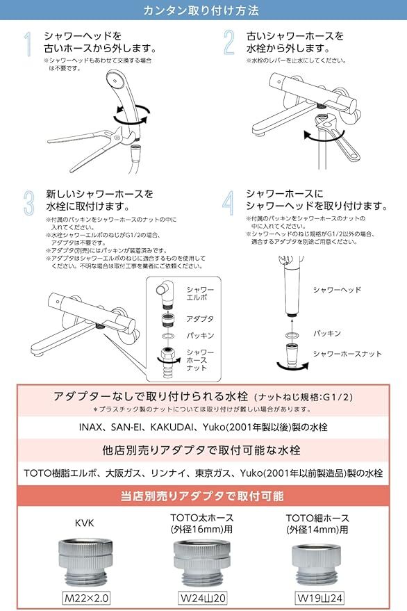 • 対応メーカー①そのまま取り付けられる(ネジ規格:G1/2):INAX(バランス釜以外)、SANEI、KAKUDAI、Yuko(2001年以降製造製品)②記載なし:別途お買い求めください。※記載のアダプターはシャワーホースと水栓を接続するアダプターです。※樹脂製のネジは取り付けが難しい場合があります。