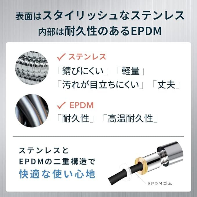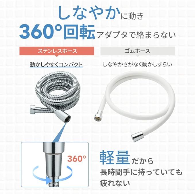• 軽量しなやかで高水圧シャワーヘッドにも対応。ステンレスホースならではの高級感と360°向きが変えられるシャワーナットで快適な使い心地。