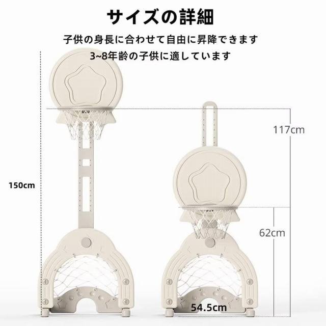 商品説明: サイズの詳細:掲載サイズ表をご参照ください。 材質:エコPE+PP材質 適合年齢:3~8歳 【子どもの運動趣味を育てる】子どもが小さい頃から運動の楽しさを体験できるようにし、子どもの手と目の組み合わせを開発し、優れた運動習慣を育て、コミュニケーション能力を高める。パーティー遊びも楽しいです。 【高さ調節自由】この子供用バスケットボールリングは複数段のビット高さ設定があり、62cm~117 cmの間の調整を行い、背面のつまみを回して様々な高さのボールフレームを調節することができる。3歳から8歳までの幅広い年齢層が運動してゲームを楽しめるようにする。 【組み立てが簡単】このバスケットボールセットの組み立てはとても簡単で、組み立てに工具も必要ありません。分解も簡単で、屋内でも屋外でも使用できます。ベースは、安定性のために砂または水で重量を減らすことができます。 【安心使用】安心なデザイン、良質な構造です。丸角の設計、しっかり固定できることだけではなく、怪我防止の効果もあります。製品は清掃やすい、耐久性もあり、変形しにくく、使用年数が長くなります。環境に優しくて良いPE+PP素材で作られています。完全に安全で味もありません。