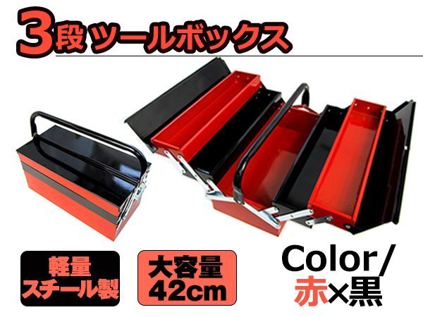 両開き 大型 3段ツールボックス 軽量スチール製4kg 大容量42cm 赤×黒 長さ42cm×幅66.5cm×高さ24cm 道具箱 車載工具 三段