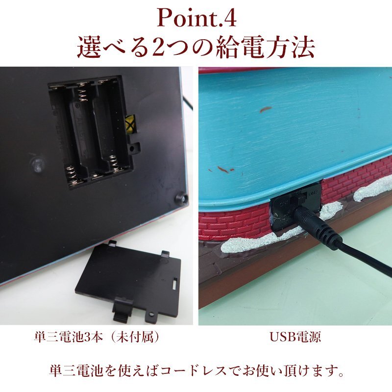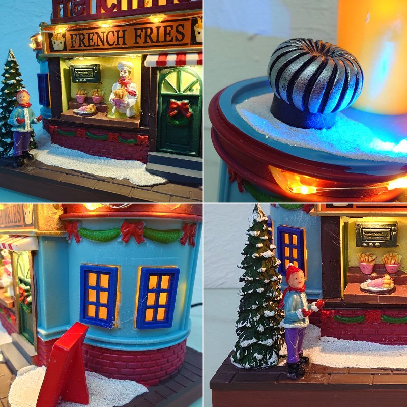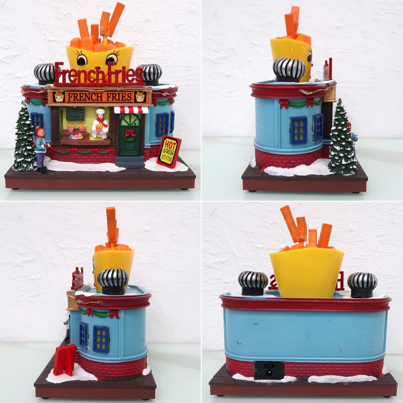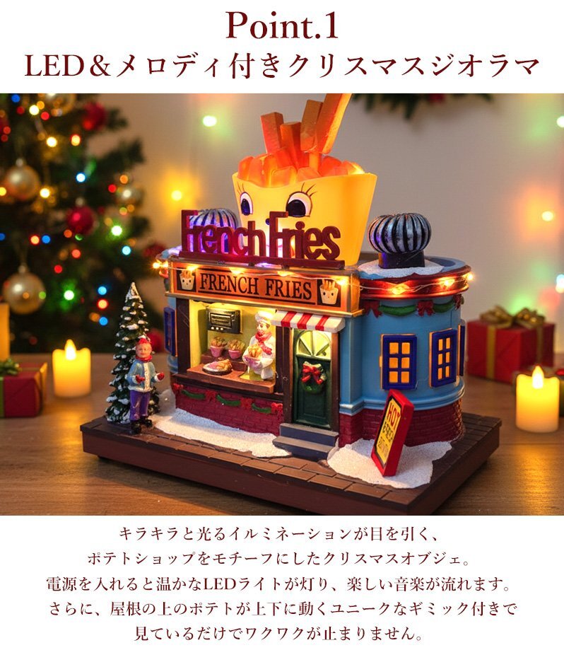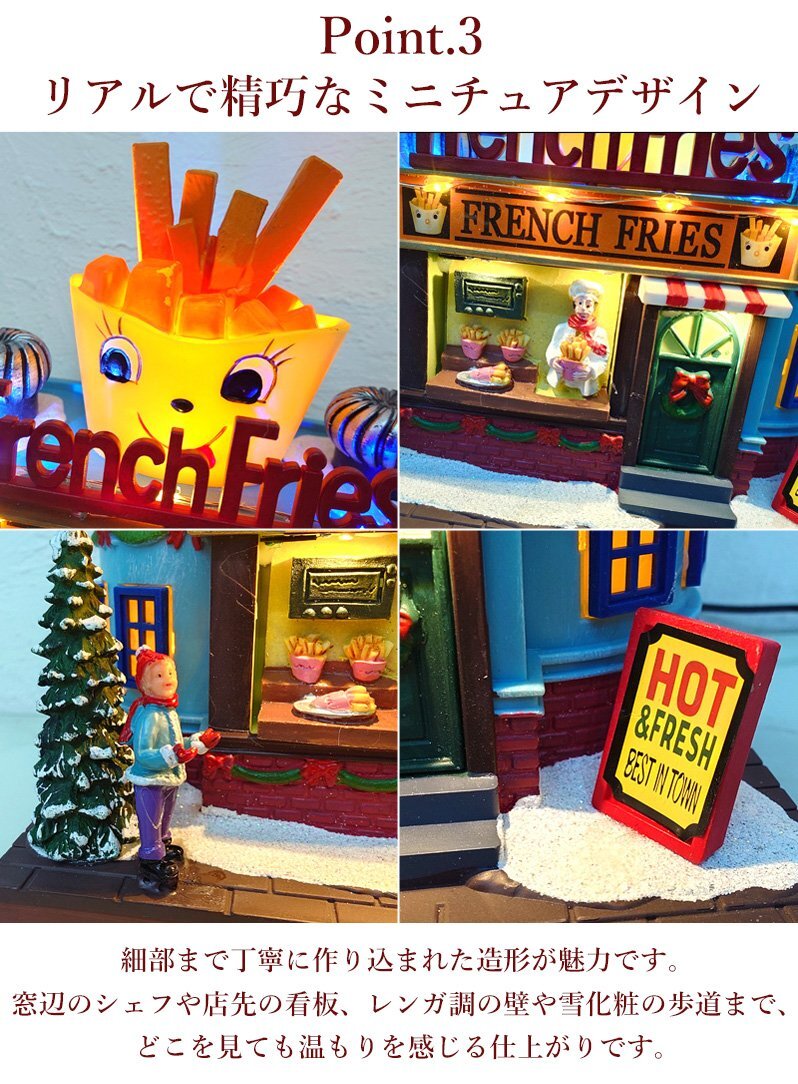 ![]() フレンチフライショップ クリスマスジオラマ キラキラと光るイルミネーションが目を引く、ポテトショップをモチーフにしたクリスマスジオラマ。 電源を入れると温かなLEDライトが灯り、楽しい音楽が流れます。 さらに、屋根の上のポテトが上下に動くユニークなギミック付き! まるで小さな街の一角にあるフードショップのようなリアルなデザインで、眺めているだけで心が弾むインテリア。 お部屋のディスプレイやギフトにもぴったりの一品です。 細部まで丁寧に作り込まれた造形が魅力で、窓辺のシェフや店先の看板、レンガ調の壁や雪化粧の歩道まで、どこを見ても温もりを感じる仕上がりです。 クリスマスのインテリアや冬のディスプレイにぴったりな、心弾むミニチュアオブジェです。 給電方法は2つ、付属のUSBコードで使用する他、 単三電池3本でコードレスとしての使用も可能! 精巧に作られている為、ライトを点灯させずに 単体でオブジェとして使用しても存在感抜群です! ギフトなどにもおすすめです! ●動作パターン● ・未点灯 ・LED点灯(音楽なし) ・LED点灯(音楽あり) ※乾電池、USB出力用のアダプターは付属しておりません。 点灯時の様子は動画でご覧くださいませ。 動画はこちら ↓↓↓↓↓↓↓↓↓↓↓↓↓ こちらをクリック! 【商品詳細】 サイズ(約): 横幅19.5cm×高さ20cm×奥行12cm コード長さ(約):185cm 重量(約):400g 素材:プラスチック・樹脂 【給電方法】 単三電池×3/USBコード |