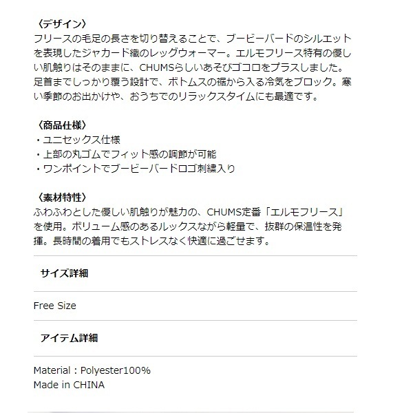 CHUMS チャムス ブービーエルモレッグウォーマー ブラック CH09-1364 フリース レッグウォーマー 保温