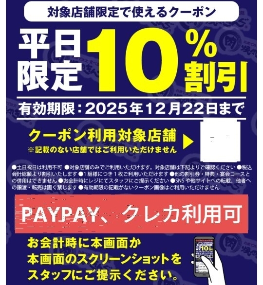 焼肉きんぐで平日ご利用頂ける最新の10%割引のクーポンです。